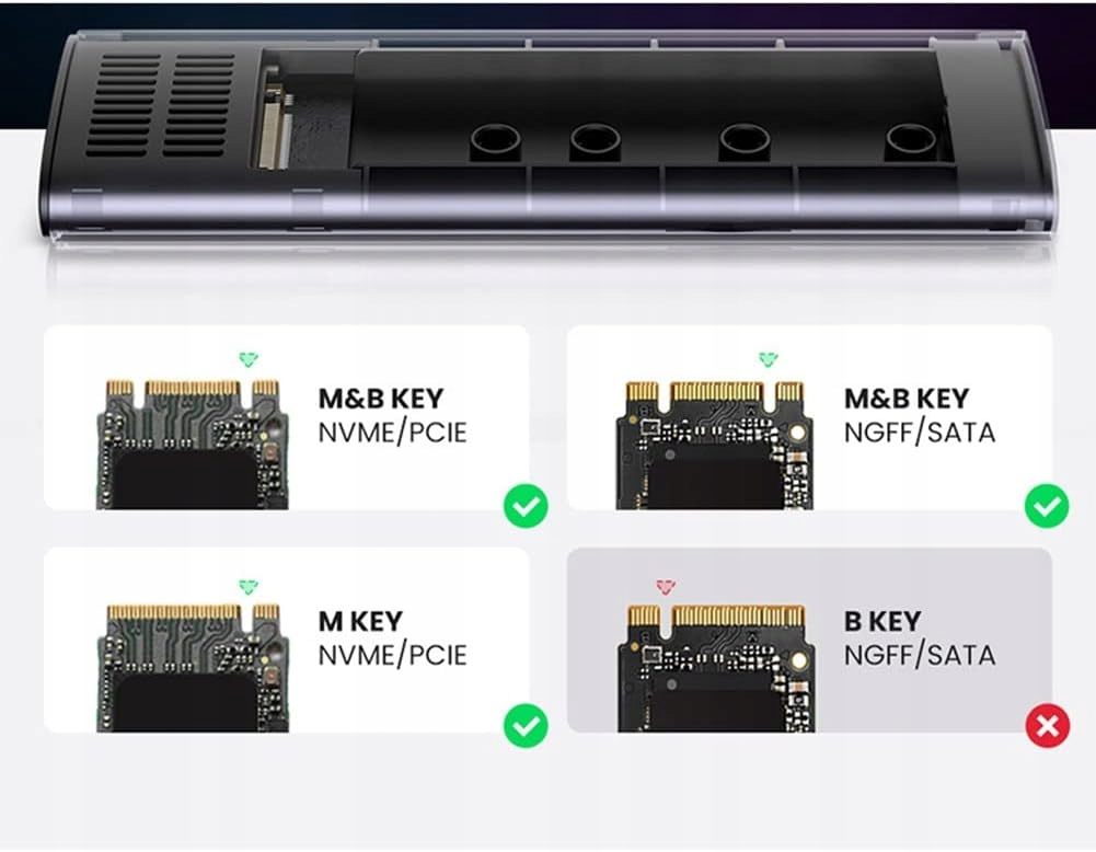 Житло підтримує обидва диски nvme pcie і sata ngff у форматі M.2, тому вам не доведеться турбуватися про відповідність. USB 3.1 Gen 2 та інтерфейс type-C Ви отримаєте швидкість читання/запису до 10 ГБ/с (для NVME) та до 6 ГБ/с (для SATA).