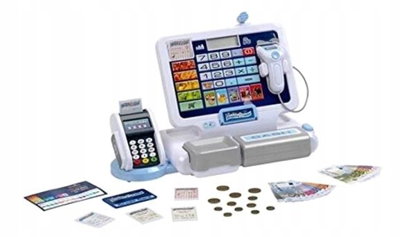 Каса магазину з терміналом і сканером, створена Klein, сіро-біла. Іграшка виготовлена ​​з якісного пластику і має безліч функцій, які зацікавлять кожного власника маленького магазину. Іграшковий касовий апарат має найважливіші елементи та функції справжнього пристрою такого типу, тобто касовий апарат, що відкривається за допомогою кнопки, ваги, сканера та терміналу з картрідером. У касі є місце для монет і банкнот. Граючись, діти можуть сканувати свій товар, вводити ціну на електронній клавіатурі дисплея та, завдяки наявному калькулятору, складати все, що можна дати покупцеві під час покупки. Касовий апарат магазину має повноцінний дисплей з калькулятором, клавіатура якого добре читається. Касовий дисплей також є знімним елементом іграшки, який можна використовувати як планшет для додаткових розваг, де, крім функції навчання рахунку на калькуляторі, ви також можете відтворити кілька мелодій або пісень, використовуючи обрані звуки в запрограмованих кнопках іграшки. Для нормальної роботи іграшки потрібні батарейки, які не входять в комплект. Каса відкривається з типовим звуком касового апарату, але окрім готівки, ви можете розрахуватися карткою. У комплект касового апарату входять монети та купюри, декілька готових квитанцій та кредитна картка. Електронний касовий апарат з платіжним терміналом - ідеальна іграшка для кожної дитини, яка любить грати в магазин.