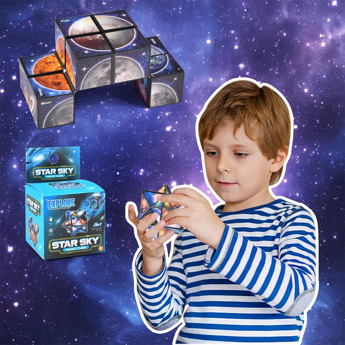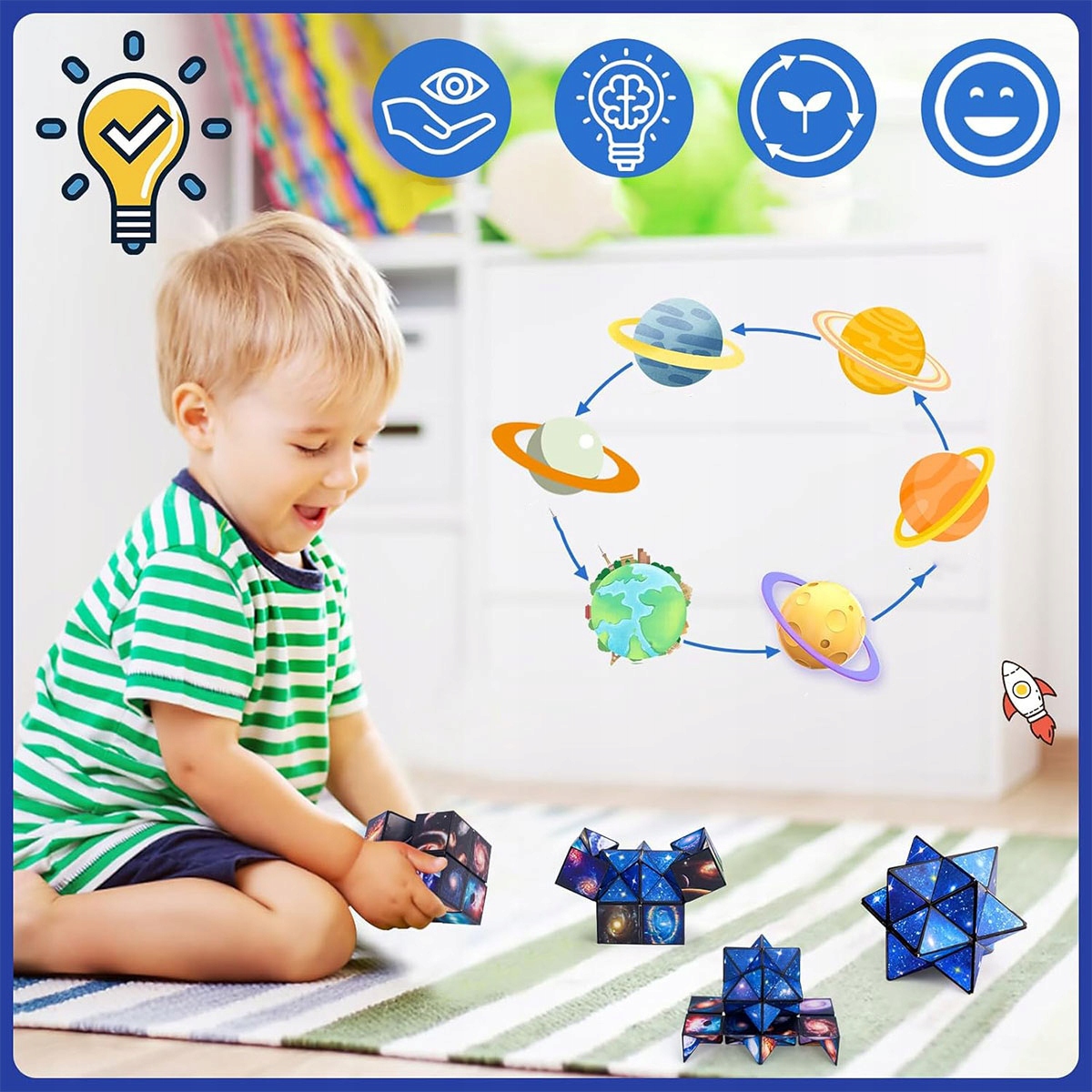 Чарівний нескінченний куб: нескінченний куб 2 в 1 — це не лише іграшка, але й головоломка. Астральний куб містить візерунки планет Сонячної системи та галактичних елементів. Він не лише тренує спритність рук і точність рухів дитини, а й навчає розпізнавати та вивчати форми та візерунки планет Сонячної системи. Це чудова навчальна головоломка IQ для дітей віком від 5, 6, 7, 8 і 9 років.