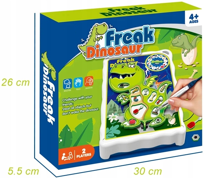 На дошці є 12 різних місць на тілі динозавра, де слід розмістити маленькі елементи/інструменти. Покрутіть колесо і подивіться, на що вказує стрілка. Спробуйте акуратно вийняти предмет з даної частини. Але будьте обережні! Все, що вам потрібно зробити, це злегка торкнутися поверхні динозавра, і він затремтить, почне дзижчати, і ви програєте. Намагайтеся не будити його.