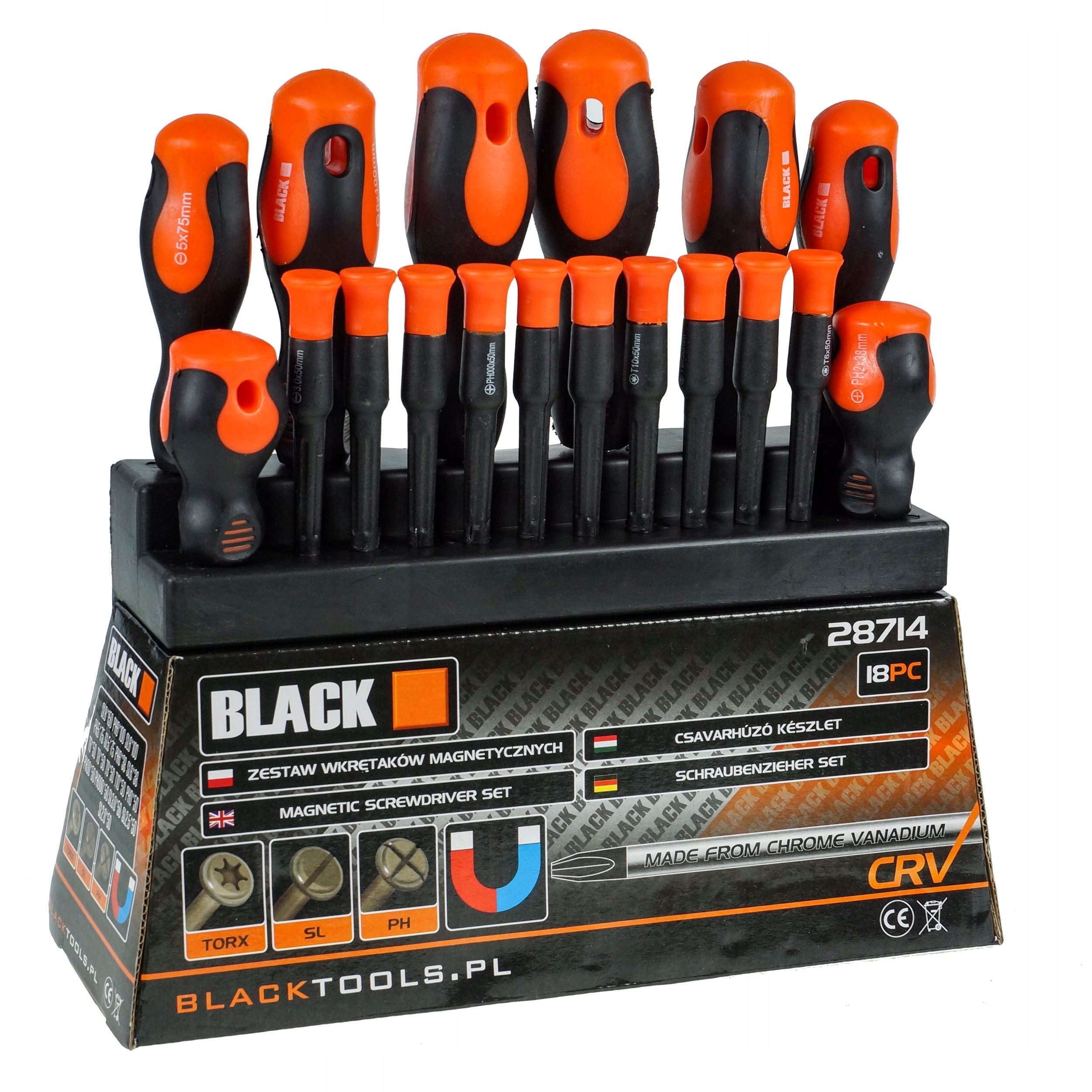 Набір з 18 викруток і викруток чорного . Виготовлені з найвищої якості матеріалів. Основні зграї, виготовлені зі сталі хромована vanadium , і закінчуються магнітним наконечником, що допоможе нам працювати в місцях, щоб важко дістатися. Ергономічні ручки з гумовими вставками забезпечують певну роботу та легку роботу.