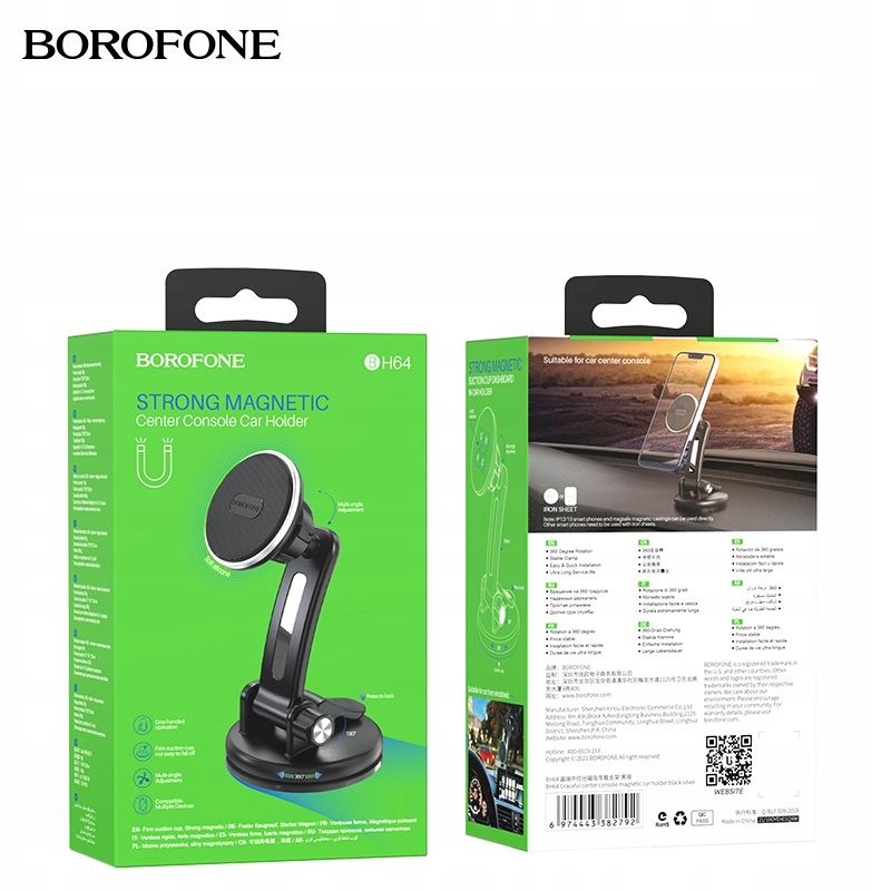 BOROFONE BH64 Graceful — це магнітний тримач для телефону, який підвищує безпеку водіння, оснащений регульованою рука довжиною приблизно 12 см, прикріплена до панелі приладів або центральної консолі автомобіля за допомогою силіконової присоски з клеєм, з магнітною монтажною поверхнею діаметром приблизно 5 см.