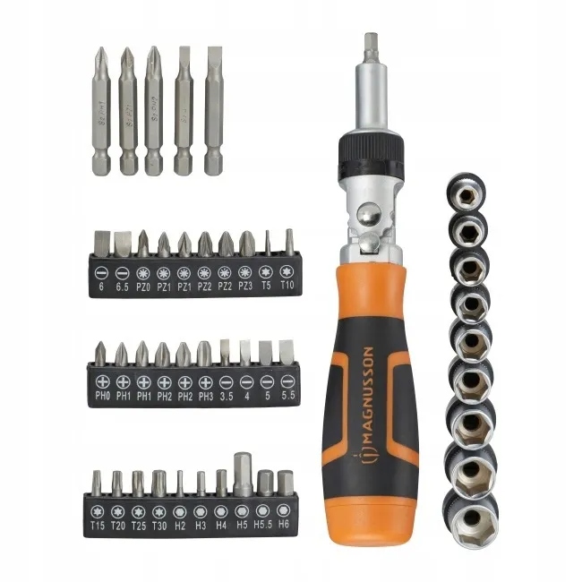 Автоматична викрутка з храпою Магнуссон з 46 взаємозамінними укусами є надійним інструментом для саморобних та професіоналів. Завдяки механізму храблення (брязкальця) можна швидко затягнути та відкрутити гвинти без необхідності постійно перекладати інструмент у руці, який прискорює та полегшує роботу. Конструкція, виготовлена зі загартованого хрому -ванадо -молібденійної сталі та зручної, двокомпонентної ручки, забезпечують точність, довговічність та комфорт використання протягом тривалого часу.