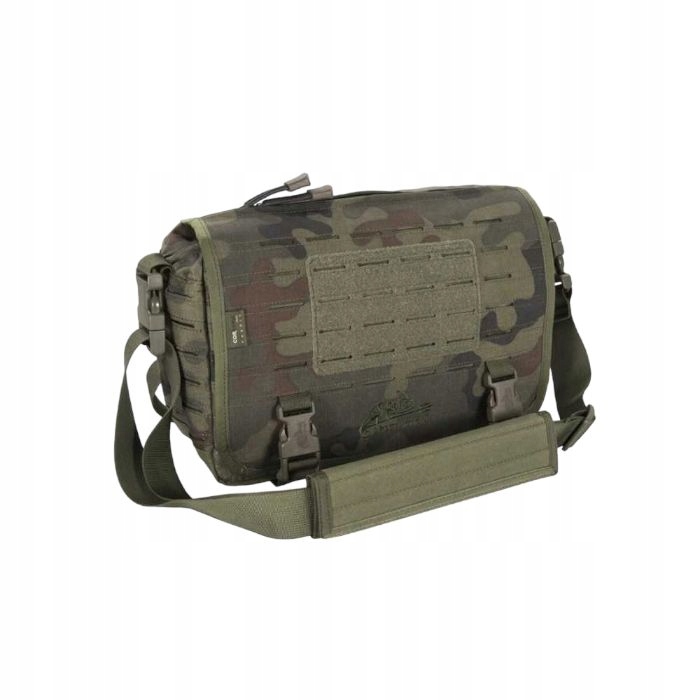 Сумка Direct Action Small Messenger Bag® покрита системою, сумісною з MOLLE/PALS, вирізаною лазером. Основне відділення сумки повністю вкрите м’якою липучкою, що дозволяє прикріпити додаткове обладнання, таке як кобури або сумки. На задній стінці основного відділення є кишеня з піноматеріалом, призначена для безпечного носіння ноутбука 11" або інших електронних пристроїв. Сумка оснащена двома зовнішніми бічними кишенями та задньою кишенею, який застібається на блискавку Просторий клапан сумки застібається на липучки та пряжки, захищаючи вміст основного відділення від бруду та води Дно сумки покрита антиковзким матеріалом З внутрішньої сторони клапана прозора кишеня на блискавці, а під клапаном дві кишені з органайзерами Сумка оснащена регульованим плечовим ременем , довжиною 120 см, шириною 5 см, з подушкою, покритою протиковзким матеріалом. Стегновий пояс шириною 2,5 см знімається.