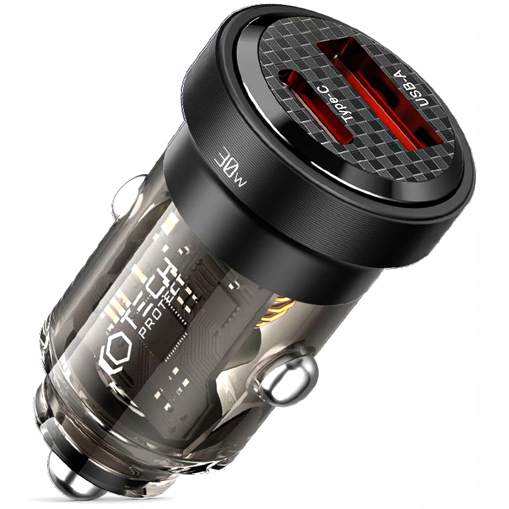 Tech-Protect CC30W — це двопортовий автомобільний зарядний пристрій із розетками загальною потужністю 30 Вт. Один із портів — типовий USB-A у стандарті швидкої зарядки QuickCharge 3.0, інший — USB Type-C із реалізованою технологією PowerDelivery.