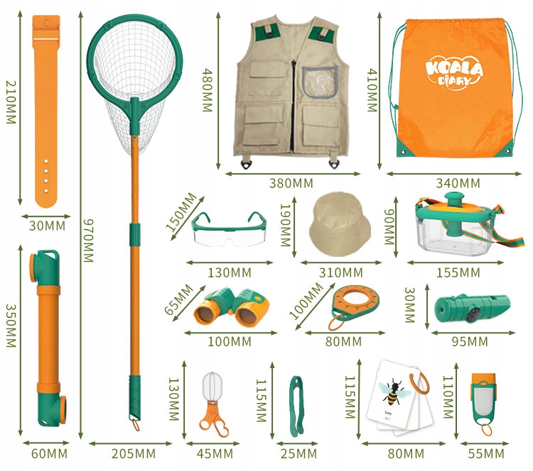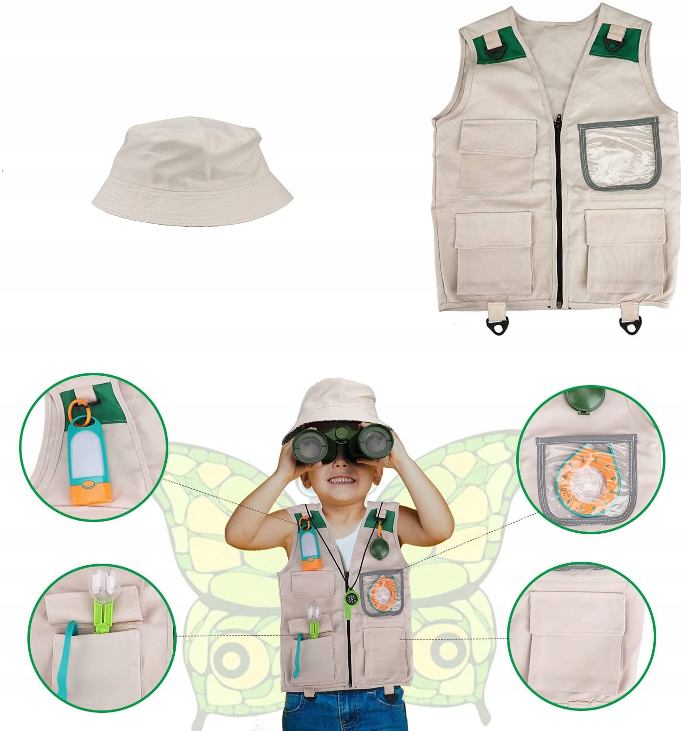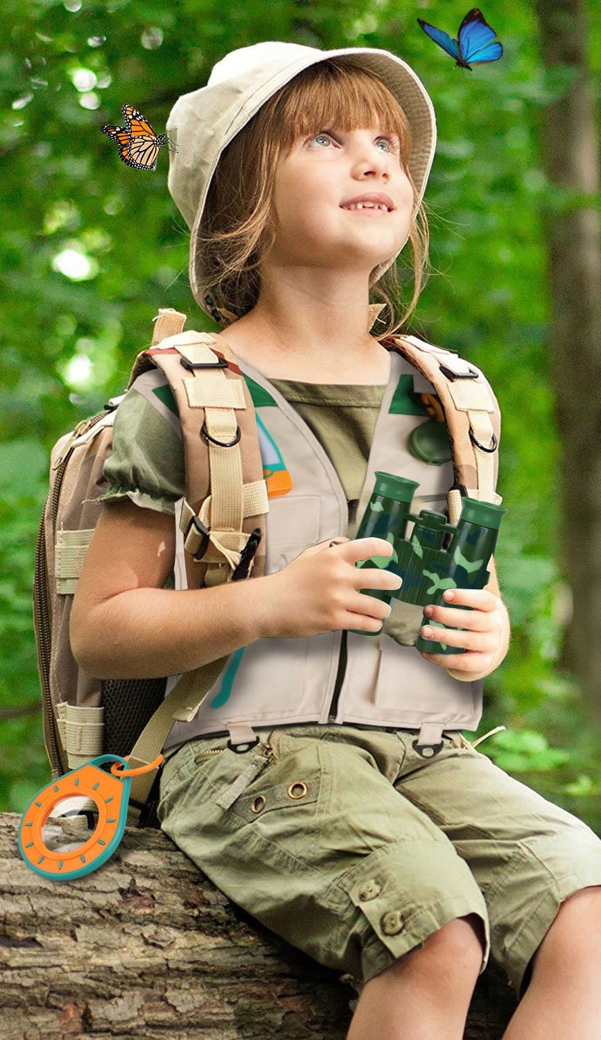 - ✅ ОДЯГ ДЛЯ МАНДРІВНИКА - щоб дитина могла краще поринути в роль мандрівника, в набір входить тематична жилетка з капелюхом та інші аксесуари дослідника.