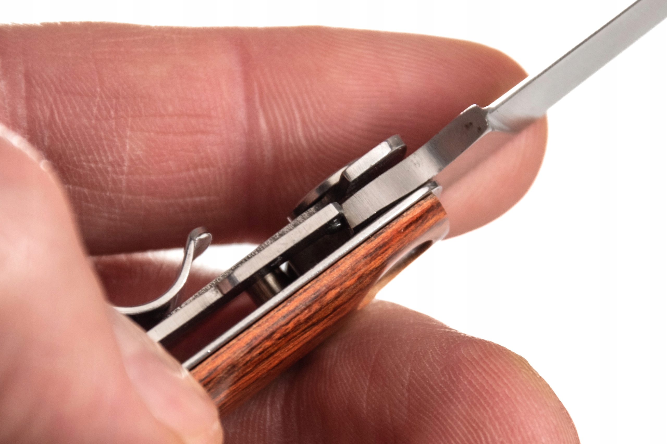 - Коли лезо повністю витягнуте, Замок linerlock автоматично ковзає на місце, фіксуючи лезо та запобігаючи його закриттю. Щоб розблокувати лезо та закрити ніж, посуньте замок до рукоятки.