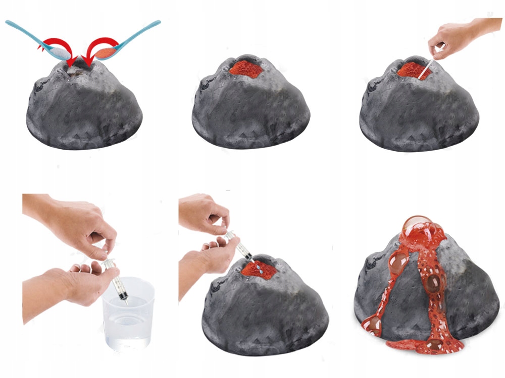2️⃣ Налийте воду в чашку, а потім наповніть нею шприц. Потім за допомогою шприца налийте воду в кратер вулкана. Робіть це обережно, щоб руки не торкалися зліпка вулкана.