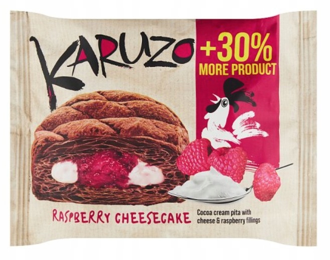 - Склад: б > пшеничне борошно, сирна начинка 20% (цукор, сир 25%, стабілізатор: гліцерин; кукурудзяна клітковина, олія пальмова рафінована, крохмаль модифікований, молочна сироватка суха, концентрована сік лайма, консервант: сорбат калію, емульгатор: полісорбат 60). Начинка малинова 10% (сироп глюкози, стабілізатор: гліцерин; пюре малинове 17,8%, сік яблучний концентрований 9%, регулятор кислотності: лимонна кислота; желеутворювач: пектин; ароматизатори, консервант: сорбат калію), олія рослинна (пальмова), цукор, жовток, сироп глюкози, какао-порошок 1,8%, дріжджі, сіль харчова, емульгатори: моно- та дигліцериди жирних кислот, ефіри моно- та дигліцеридів жирних кислот з моно- та діацетилвинною кислотою, сухе молоко, ароматизатори, консерванти: кальцію пропіонат, сорбінова кислота. Може містити сліди арахісу.