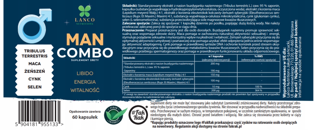 MAN COMBO - це агресивна експансія Lanco Nutritions на ринок добавок для чоловіків. Наша пропозиція адресована всім чоловікам, які піклуються про своє здоров'я і хочуть природним і довгостроковим шляхом відновити своє лібідо та врегулювати свій гормональний та енергетичний баланс. Завдяки унікальному складу екстрактів, що містяться в препараті, ви зможете природним чином стимулювати рівень вашої сексуальної енергії та тестостерону, набратися бадьорості та підвищити життєвий тонус свого тіла, зміцнюючи його, підвищити ефективність тренувань та зміцнити себе внутрішньо. . Це не чарівна пігулка з миттєвим ефектом протягом кількох годин, а послідовна та природна добавка для організму, яка може принести вам довготривалий ефект.