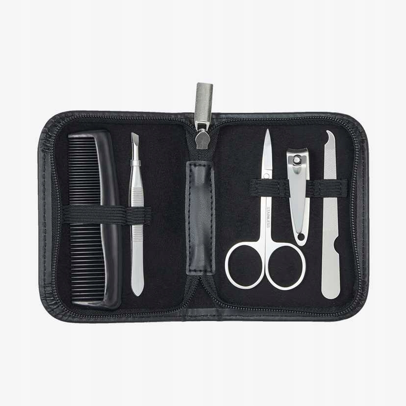 Полегшіть йому виконання косметичних процедур завдяки елегантному футляру кишенькового розміру з п’ятьма основними аксесуарами.