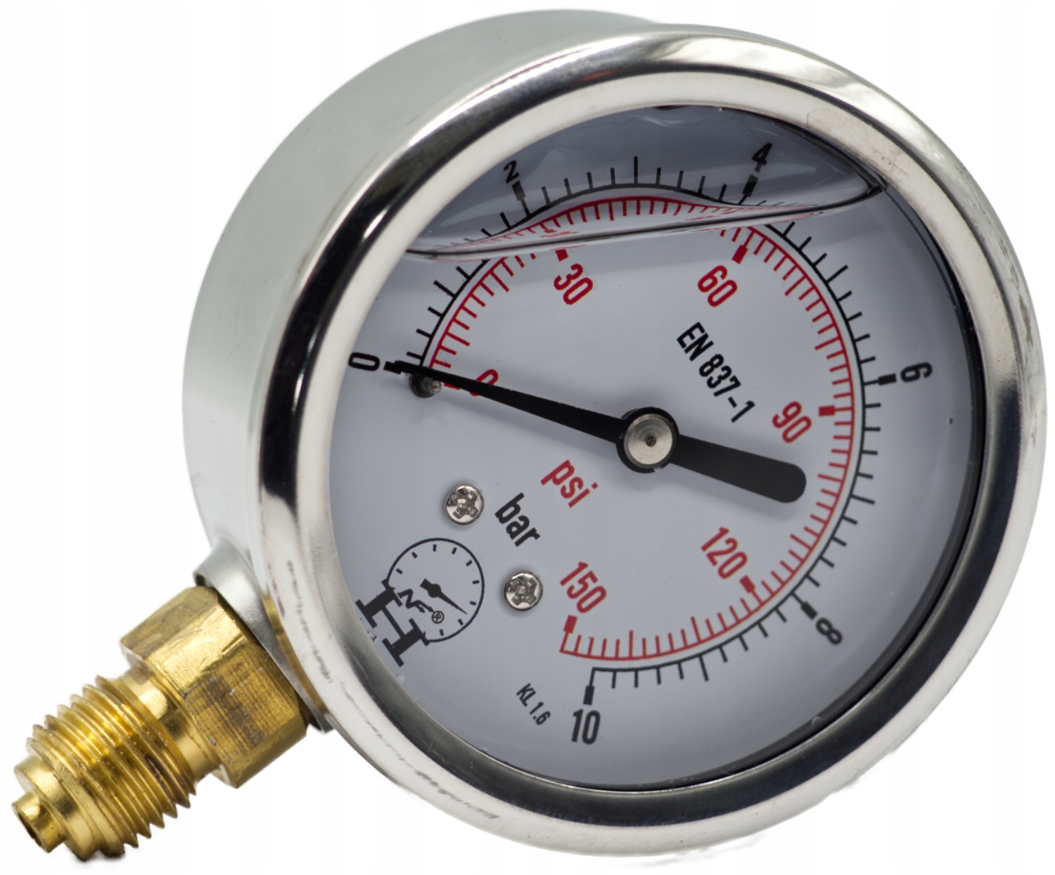 Гідравлічні манометри 0-10 бар з нижнім підключенням 1/4", діаметр диска 63 мм, заповнені гліцерином.