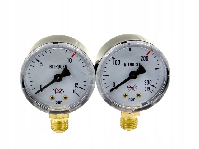 Набір з 2-х манометрів [балон і робочий манометр], призначений для редуктора NITRIZ. Манометри підходять до редукторів серії 128 та інших, що продаються на польському ринку. Максимальний тиск на вході та виході позначено червоною лінією на манометрах.