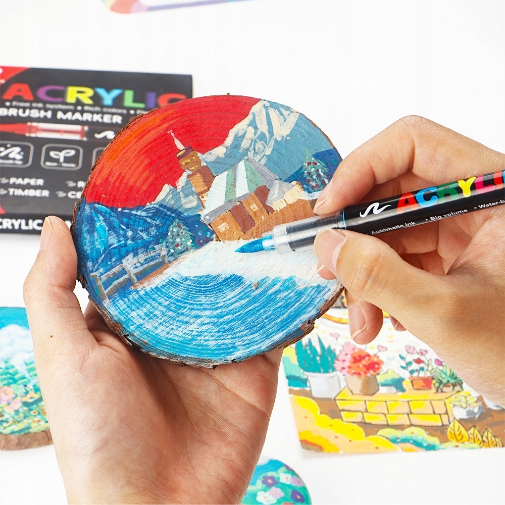 - Водостійкі акрилові маркери можна використовувати на різноманітних поверхнях, включаючи дерево, камінь, скло, кераміку, тканини та пластик.