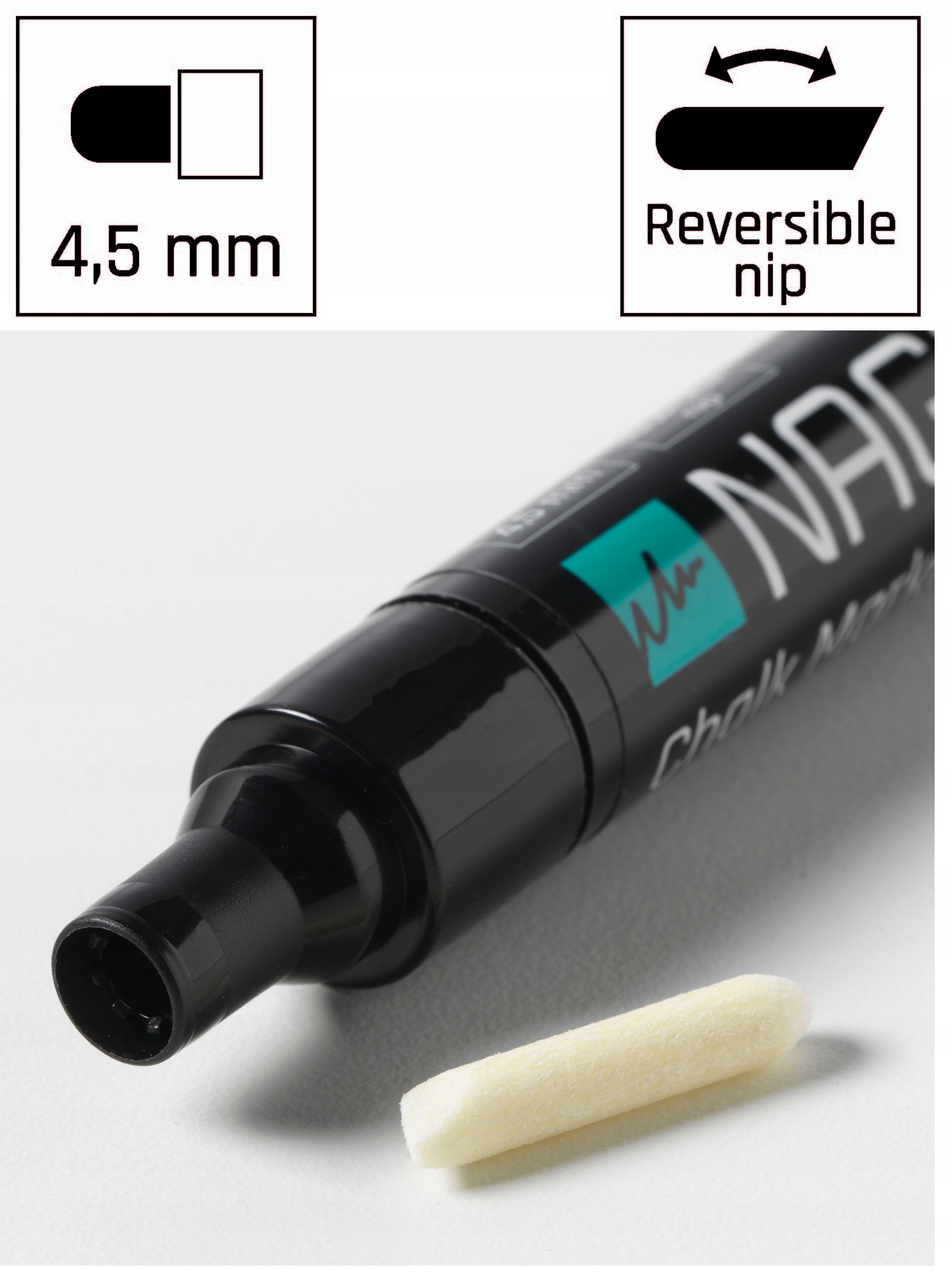 Крейдяні маркери 4,5 мм додатково мають реверсивний наконечник (кінчик) – м’який кульковий або гострий.