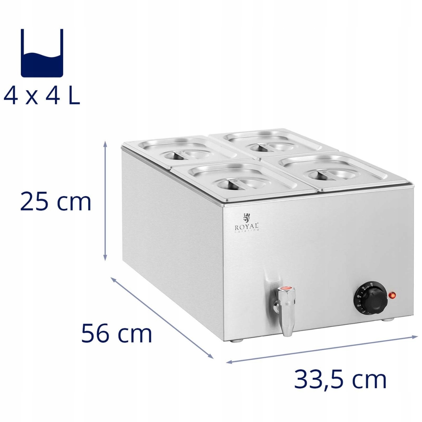Чи звучить апетитно свіжа їжа, яка довго зберігалася теплою? Це можливо з мармітом від Royal Catering! У 4 контейнери GN ви можете розмістити напр. м'ясо, риба, картопля, рис або соус. Вони будуть підтримувати потрібну температуру, не пригораючи. Опалювальний марміт оптимально задовольнить потреби навіть висококласних закладів громадського харчування.