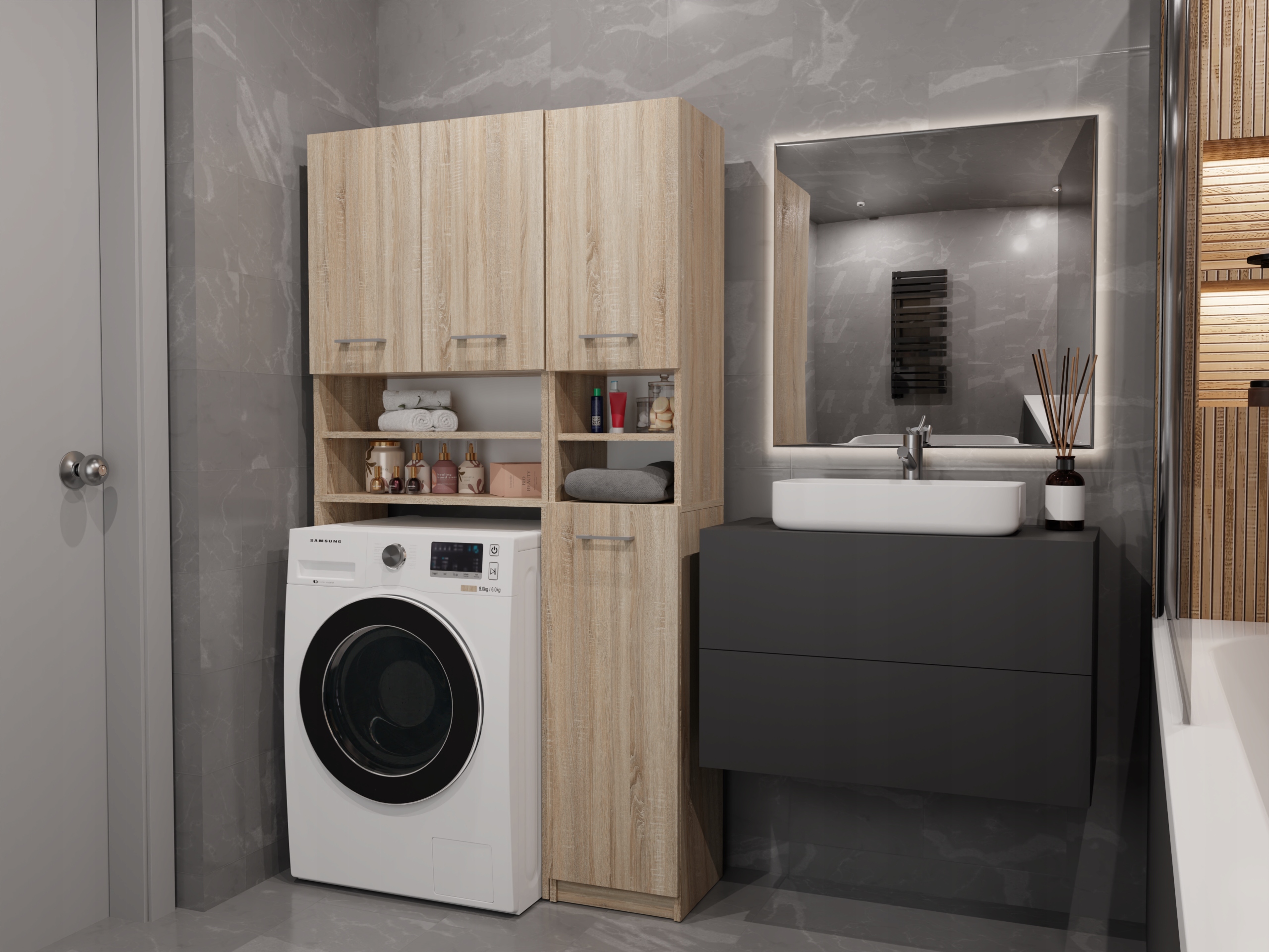 У кожній ванній кімнаті знайдуться речі, яким потрібно своє місце. Завдяки практичним стійкам ви отримаєте простір для пральної машини та ефективно контролюєте безлад, не займаючи зайвого місця.