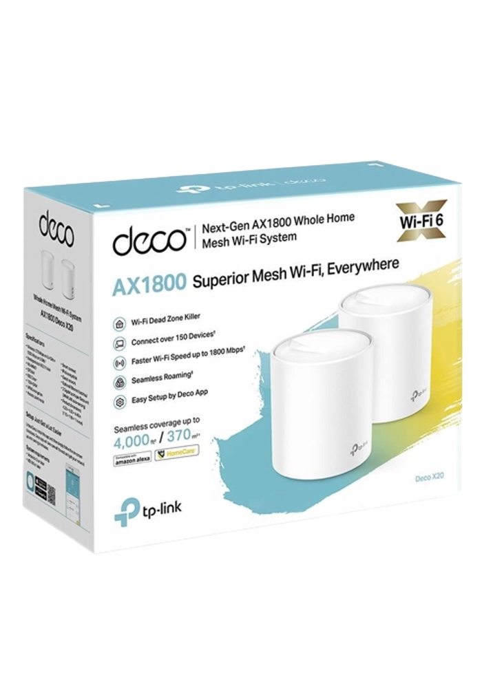 Маршрутизатор TP-LINK Deco X20 (2 шт.) AX1800 Wi-Fi 6 mesh-маршрутизатор – Deco X20 – це домашня система Wi-Fi Wi-Fi 6, розроблена для забезпечення повнішого покриття дому та вищої швидкості і більш висока ефективність роботи. Відчуйте потужність новітньої технології Wi-Fi Mesh, підключивши більше пристроїв і передаючи дані швидше, ніж будь-коли раніше. Потужний сигнал Wi-Fi, посилений забарвленням BSS і технологією Beamforming, досягає всіх куточків будинку, охоплюючи площу до 540 м2. Бездротові з’єднання та додаткове резервне з’єднання Ethernet з’єднують пристрої Deco для ще більшої швидкості та безпрецедентної плавності перемикання.