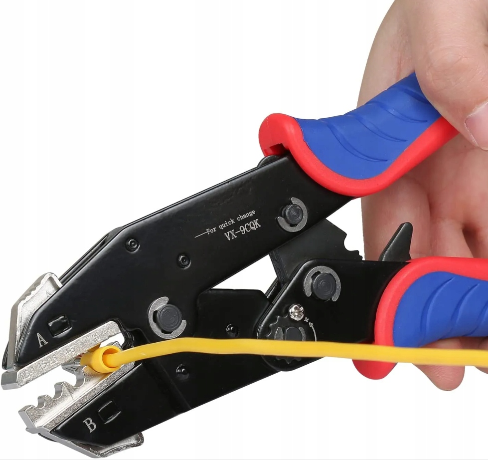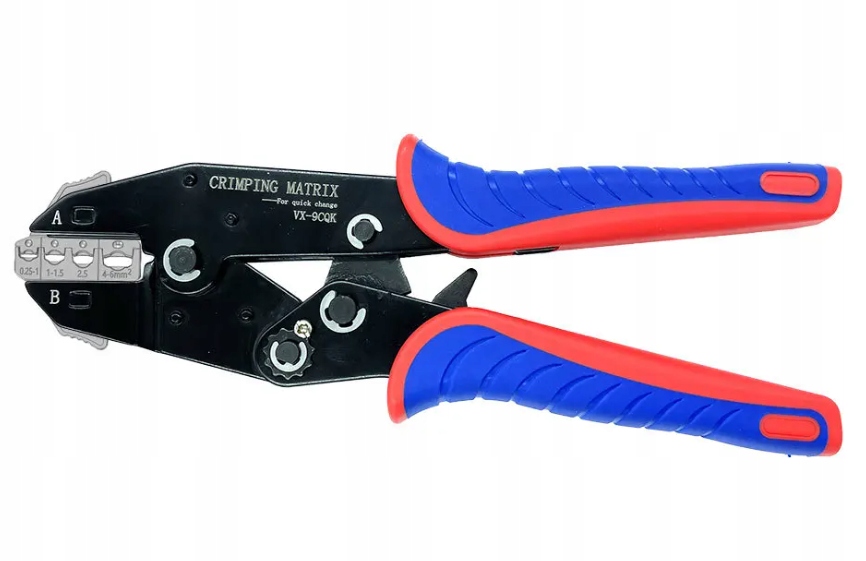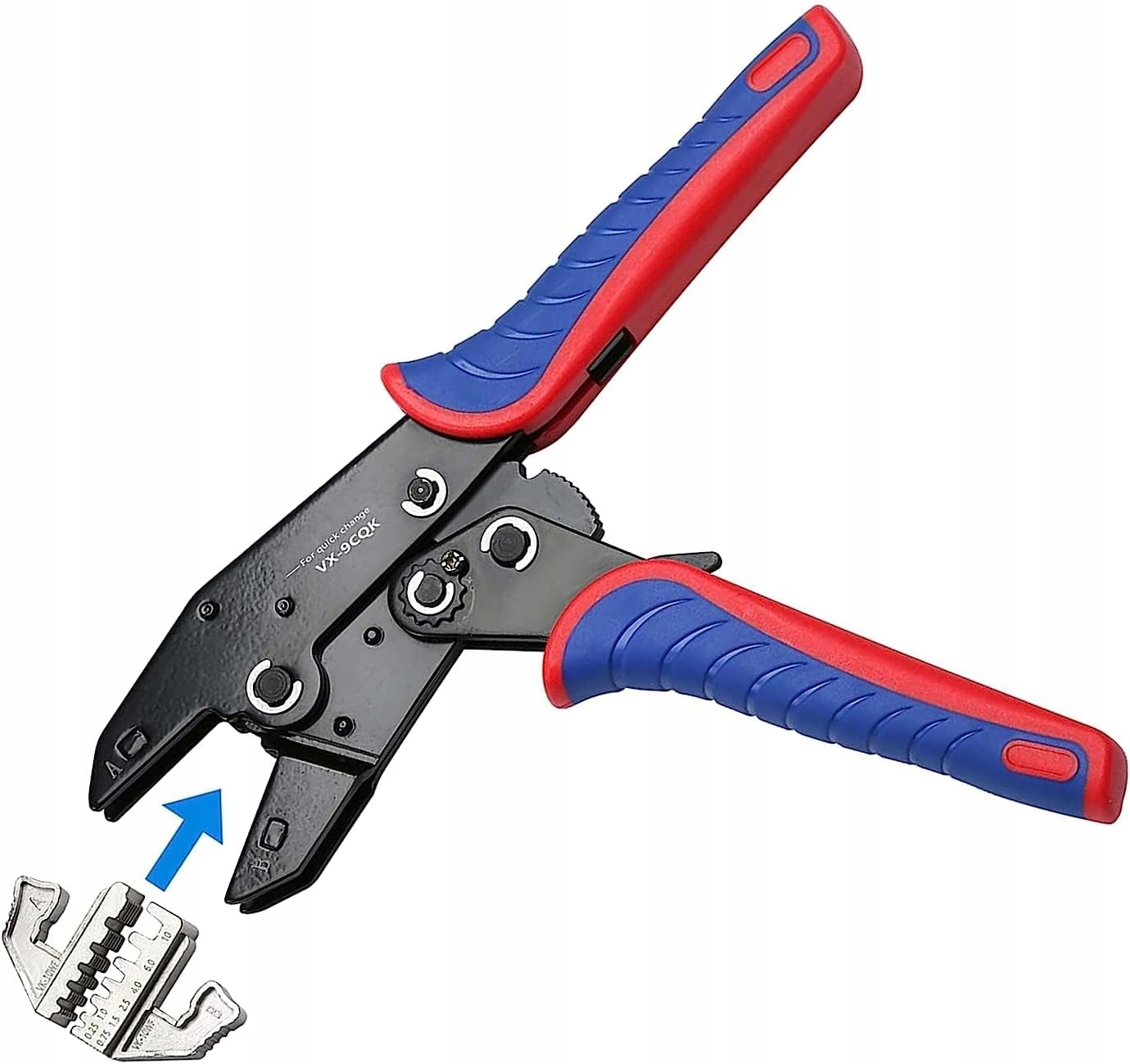 Щипці для обтиску з’єднувачів із 5 змінними плашками з почорнілою поверхнею, яка захищає від корозії, і пластиковими кришками ручок. Храповий механізм дозволяє швидко і точно обтискати без застосування надмірної сили.