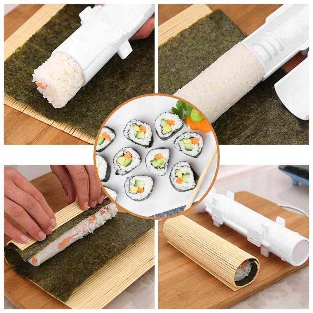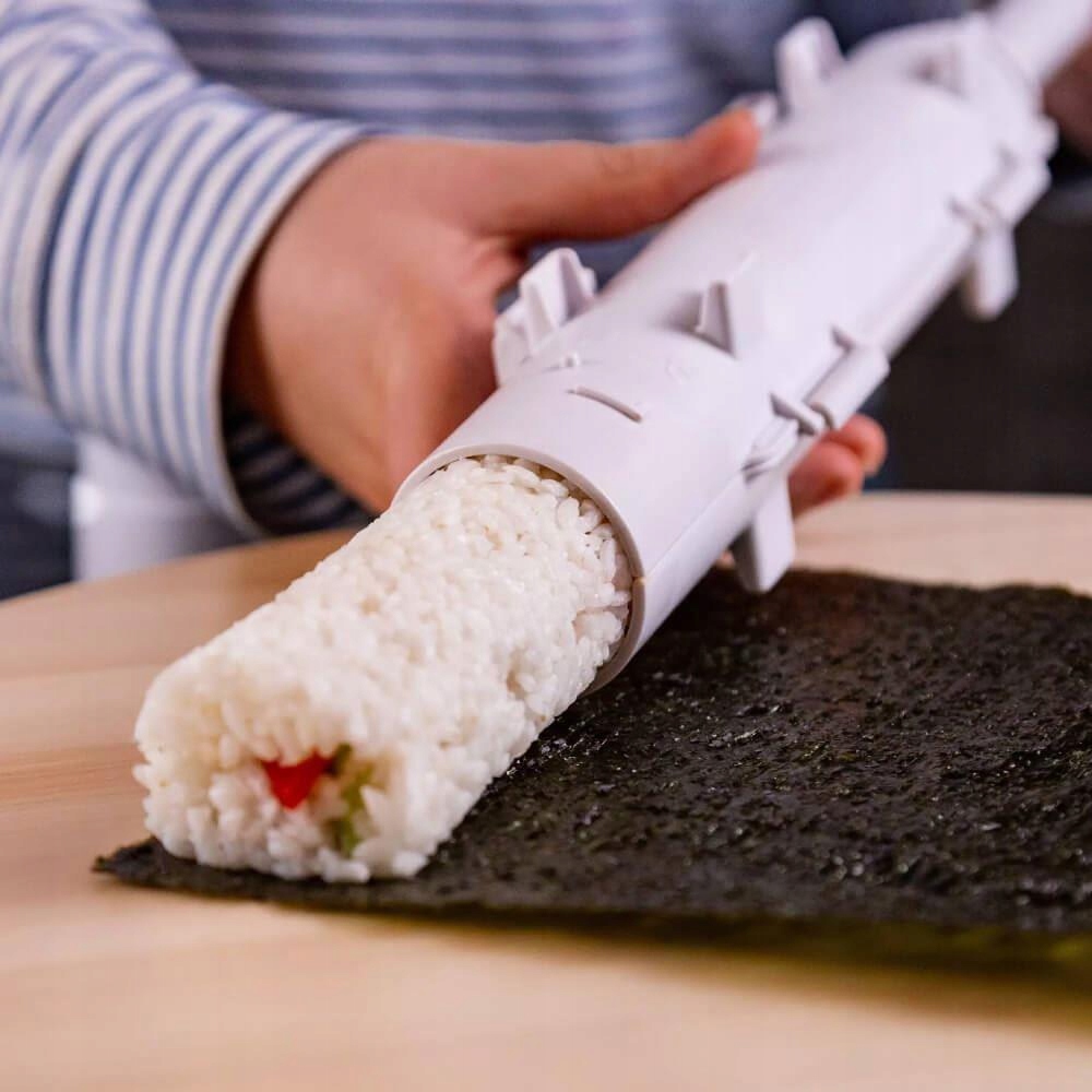 Ви швидко навчитеся користуватися цим інструментом — ваше єдине завдання — наповнити форму рисом і підготовленими інгредієнтами, нарізаними довшими смужками. Ви можете вибрати, наприклад, лосось, тунець, огірок або авокадо. Закриваємо форму з начинкою і поршнем видавлюємо начинку на підготовлений лист водоростей. Потім просто загорніть його, розріжте отриманий рулет і готово! Рекомендуємо подавати суші з соєвим соусом.