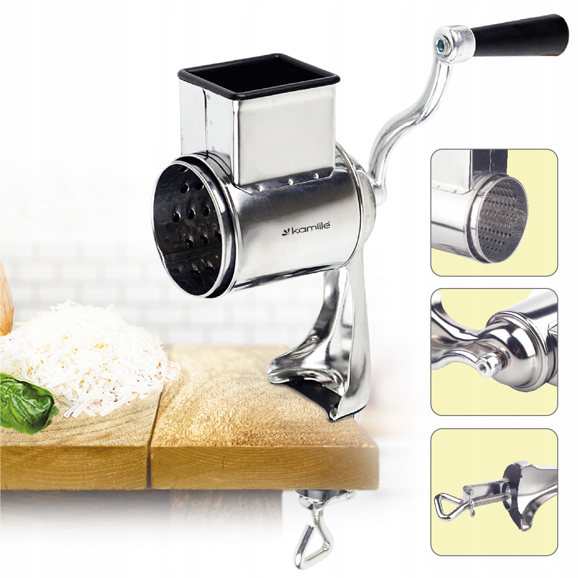 Ручна подрібнювач фруктів і горіхів Kamille виготовлена з високоякісної нержавіючої сталі. Ідеально підходить для подрібнення горіхів, натирання сиру, шоколаду або приготування панірувальних сухарів. Всі металеві елементи виготовлені з нержавіючої сталі. Має лещата, які забезпечують стабілізацію пристрою під час роботи.