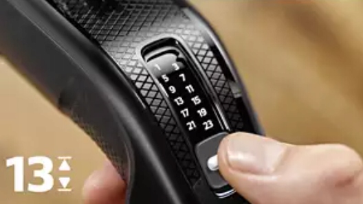 Просто виберіть і зафіксуйте потрібну довжину. Регульована гребінець пропонує 12 фіксованих налаштувань довжини від 1 мм до 23 мм. Відстань між наступними налаштуваннями рівно 2 мм. Ви також можете зняти насадку та коротко підстригти волосся до 0,5 мм.