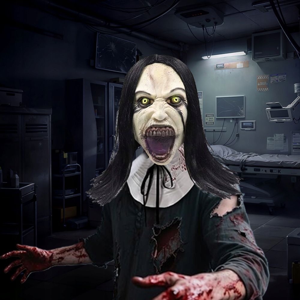 ПОВНА ПІДТВЕРДЖЕННЯ: латексна маска на всю голову із зображенням демонічної жіночої привиди зі спотвореним обличчям, відкритим ротом і розпущеним волоссям. Ефект надзвичайно реалістичний і жахливий з усіх боків!
