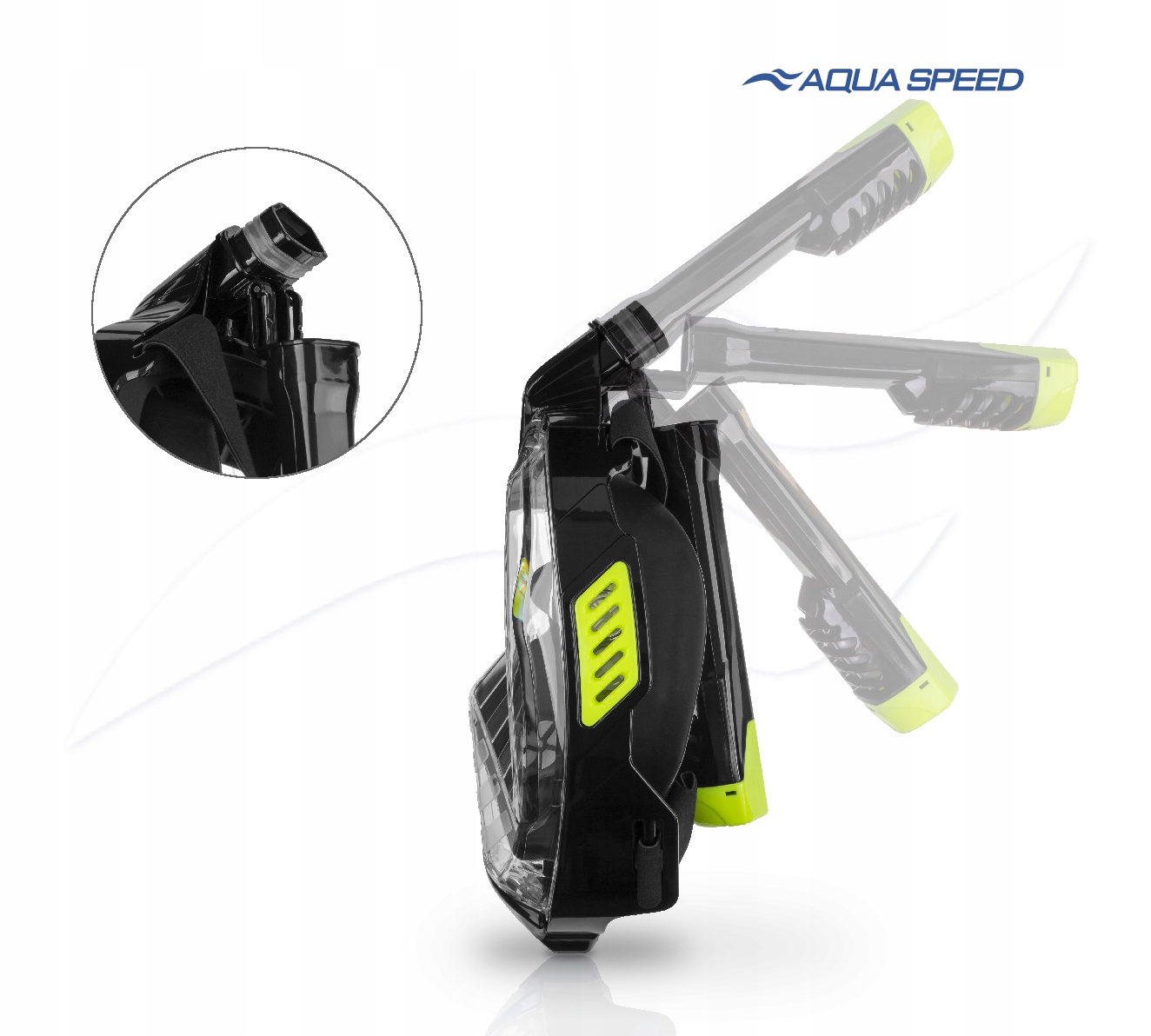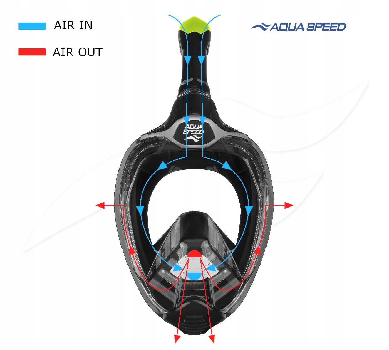Маска оснащена чотирма випускними клапанами з боків маски. Завдяки цьому весь поперечний переріз трубки відповідає лише за втягування повітря в маску, що значно збільшує свободу дихання.