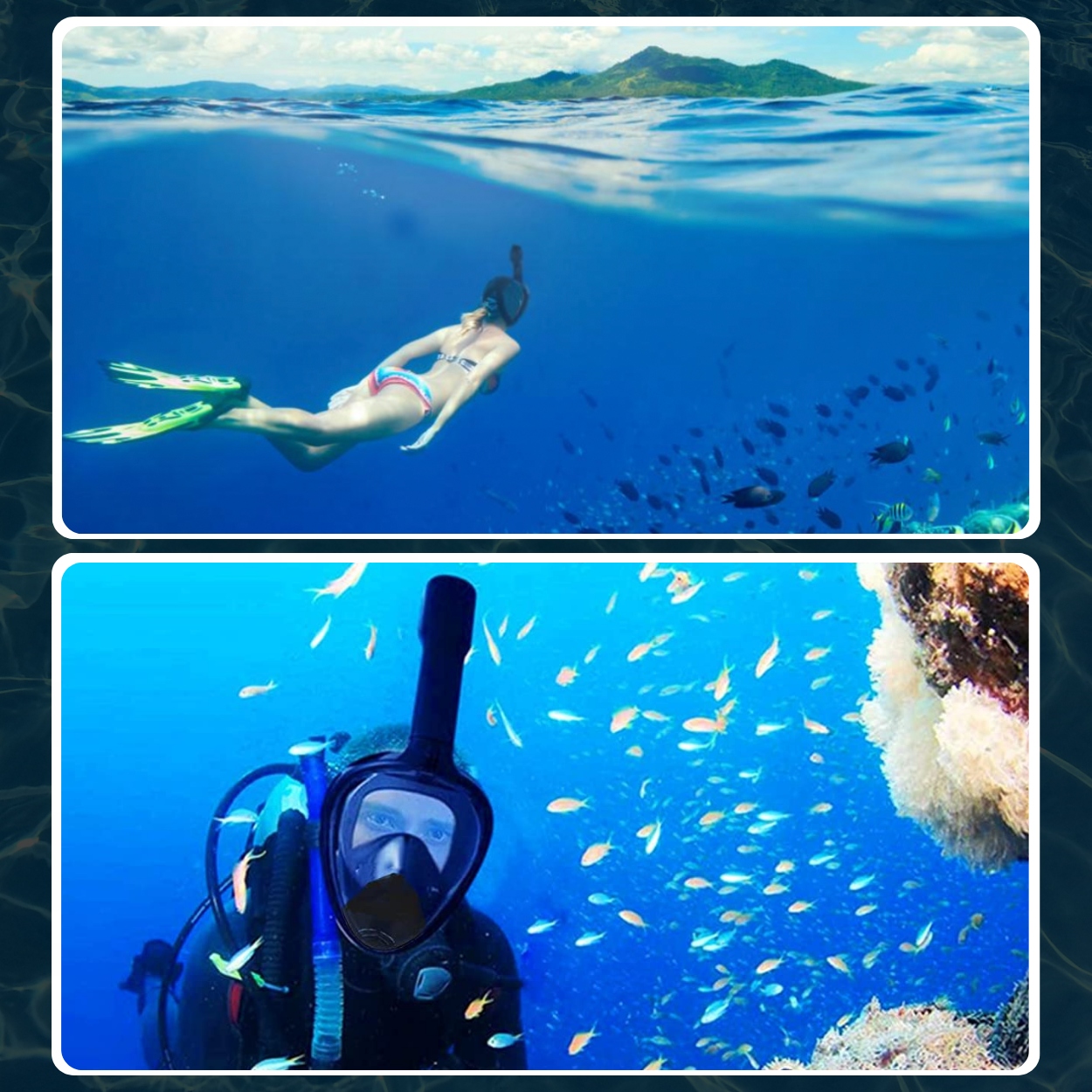 Підводне плавання — це вид спорту, який дозволяє спостерігати за підводним життям. Повнолицева маска для підводного плавання створена для всіх шанувальників цього унікального виду спорту. Завдяки йому можна в комфортних умовах милуватися красою підводної фауни і флори. Він виготовлений з матеріалів найвищої якості, що гарантує безпеку та комфорт. Його форма та силіконовий комір, який дуже легко всмоктується, ідеально прилягають до обличчя, а завдяки великому округлому склу покращується перспектива та видимість під водою.