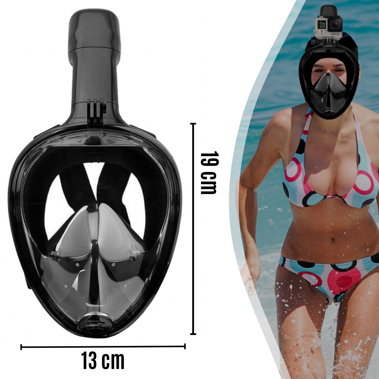 Поверхня маски сконструйована таким чином, щоб забезпечити поле зору 180 градусів. Крім того, маска не тисне на обличчя, а її міцна система кріплення та регульовані широкі лямки гарантують, що вона не впаде навіть під час стрибка у воду.