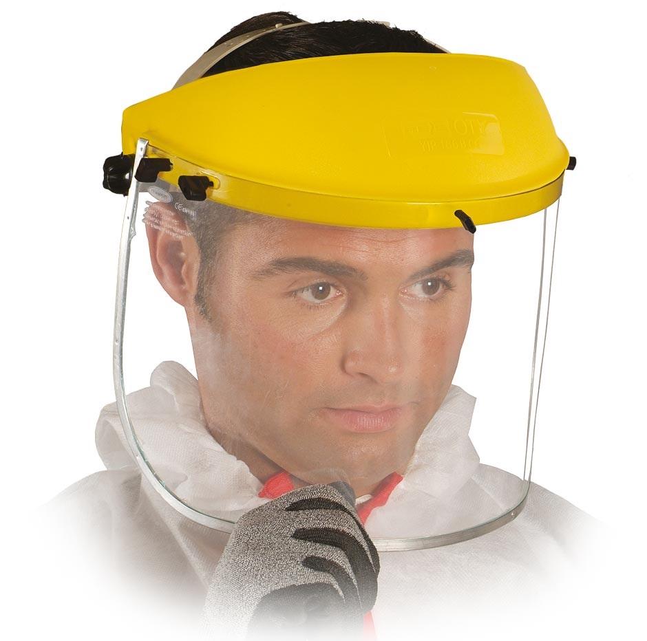 Щиток для обличчя, що складається з лінзи проти бризок, головного убору та шарніра.