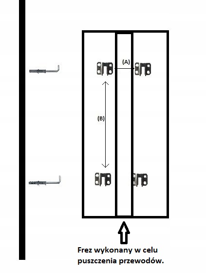 1. Підвіси слід прикрутити до кришки, встановивши ширину (A) відстані, необхідної для приховування бажаної кількості кабелів. Відстань (B) можна визначити вільно, однак вішалки не слід розташовувати занадто близько - рекомендується розташовувати їх у пропорції, подібній до зображеного на кресленні навпроти.