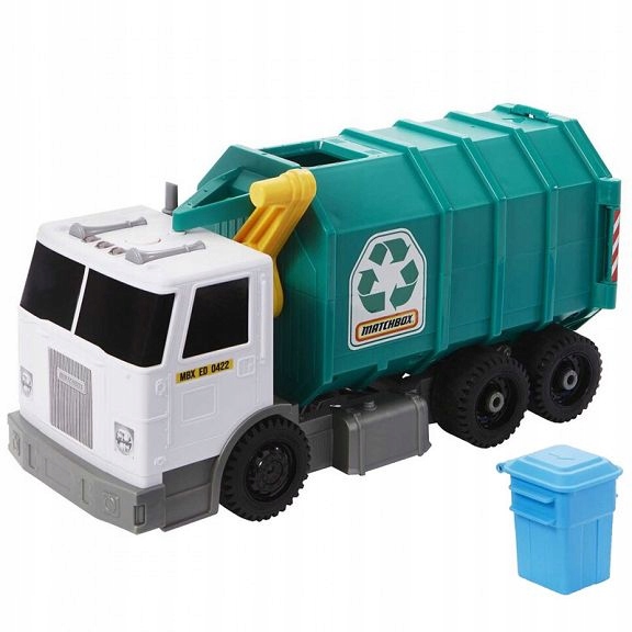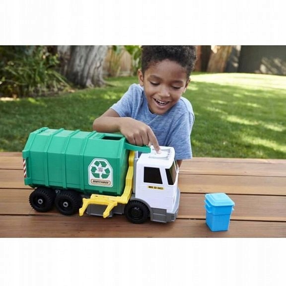 - Сірниковий сміттєвоз Matchbox Recycling Garbage Truck (38 см) — це великий екологічний транспортний засіб, виготовлений із пластику, сертифікованого на 80% ISCC*, із безліччю дивовижних функцій і деталей, які надихають на творчу гру.