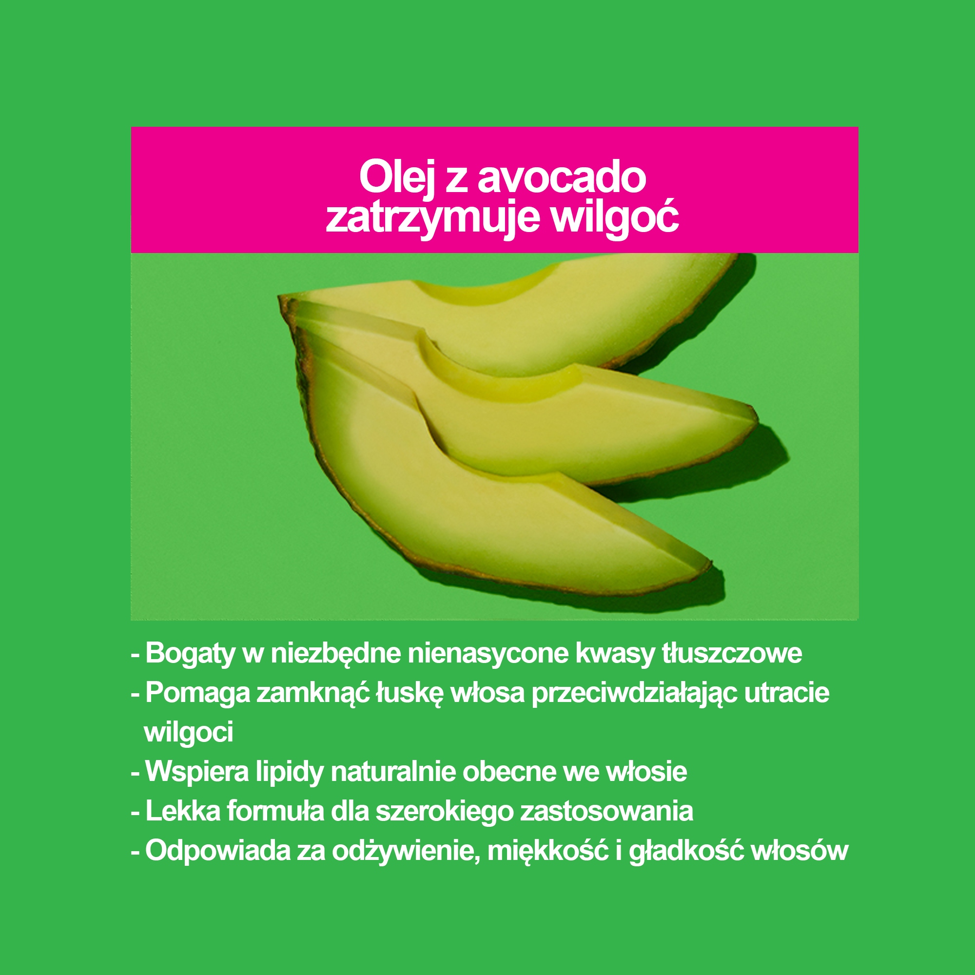 Олія для волосся, наповнена олією авокадо, є доглядом, який не змивається. допомагає підтримувати належний рівень зволоженості волосся, роблячи його блискучим і гладким.