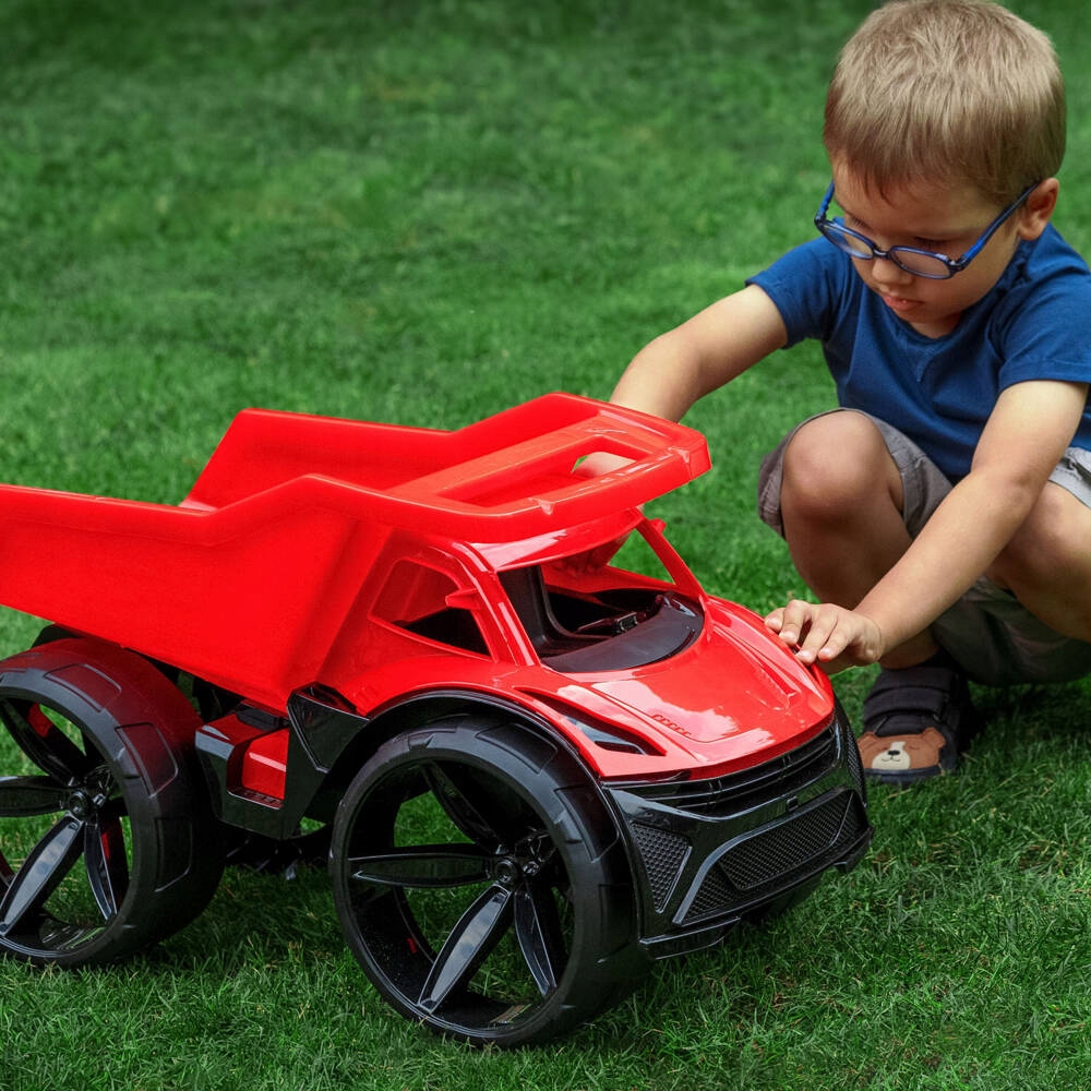 MAXIMUS - це великий самоскид соковитого червоного кольору, який вирізняє: сучасний дизайн, міцна, легка конструкція, сучасна лінія кузова з великими матовими колесами та красивими деталями обробки. Крім того, він має рухливу верхню частину, що відкривається, і зручну ручку, що дозволяє різноманітно і реалістично грати; його можна використовувати для транспортування піску або інших іграшок. Довжина транспортного засобу становить 59 см.