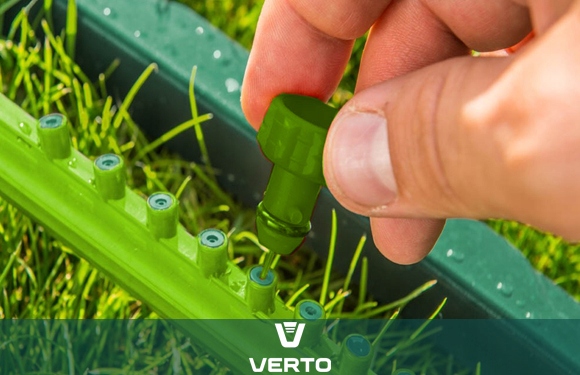Оцилюючий садовий спринклер з площею розпилення до 336 м2 від VERTO. Має 16 розпилювальних форсунок і голку для розблокування форсунок.
