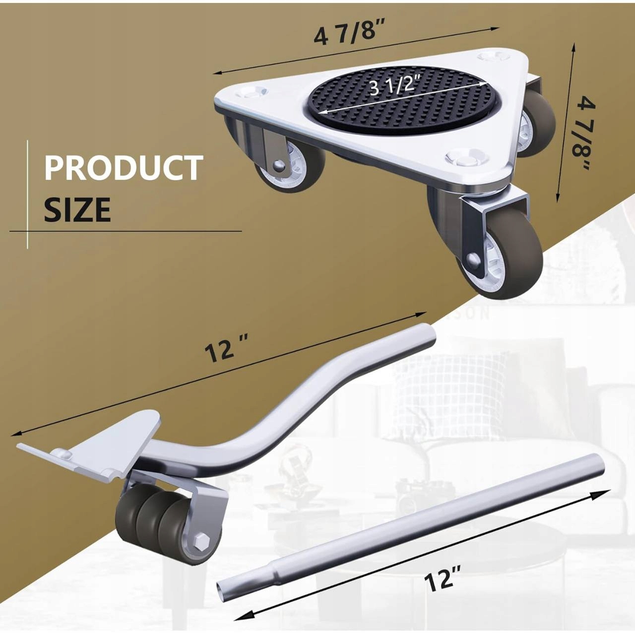 Професійний набір для легкого переміщення меблів та побутових приладів. Він складається з 4 трикутних платформ на колесах та підйомному важелі. Вантажівка до 720 фунтів (приблизно 327 кг)! Ідеально підходить для диванів, шаф, пральних машин та інших важких предметів. Особливості продукту: