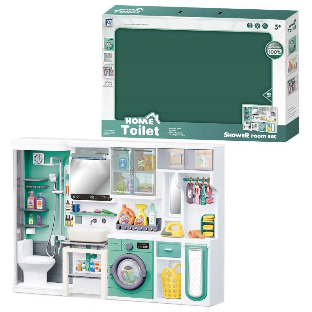 Комплект меблів для ванної складається з наступних елементів: прасувальної дошки, пральної машини, умивальника, унітазу та душової кабіни. Також є аксесуари для ванної кімнати та верхні шафи. Звукові та світлові ефекти.