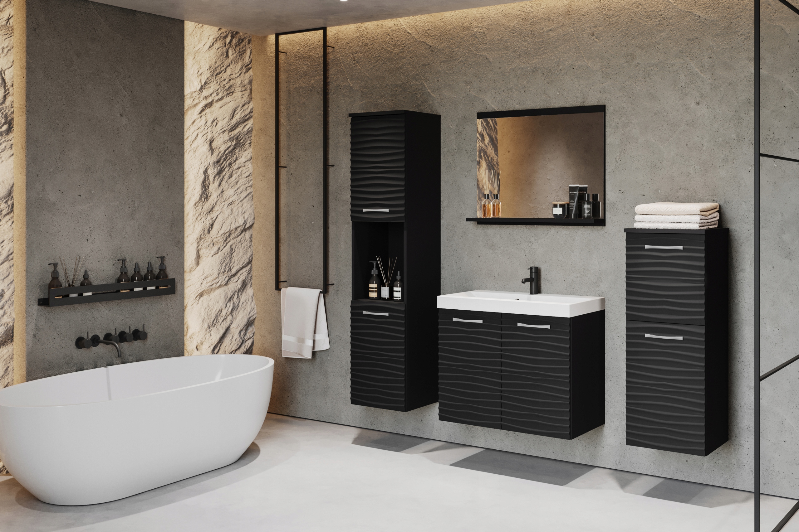 ➡️ Набір меблів для ванної кімнати з матовим чорним МДФ ПЕРЕДНИМИ ПЕРЕДНЯМИ створює гарний настрій. Набір підвісних меблів для ванної кімнати MARS є чудовим вибором, оскільки він містить усі елементи, які створять гармонійний простір і багато місця для зберігання необхідних речей у цій частині вашого дому. Крім того, кольори різних відтінків деревини чудово впишуться в будь-який інтер’єр, додадуть тепла.