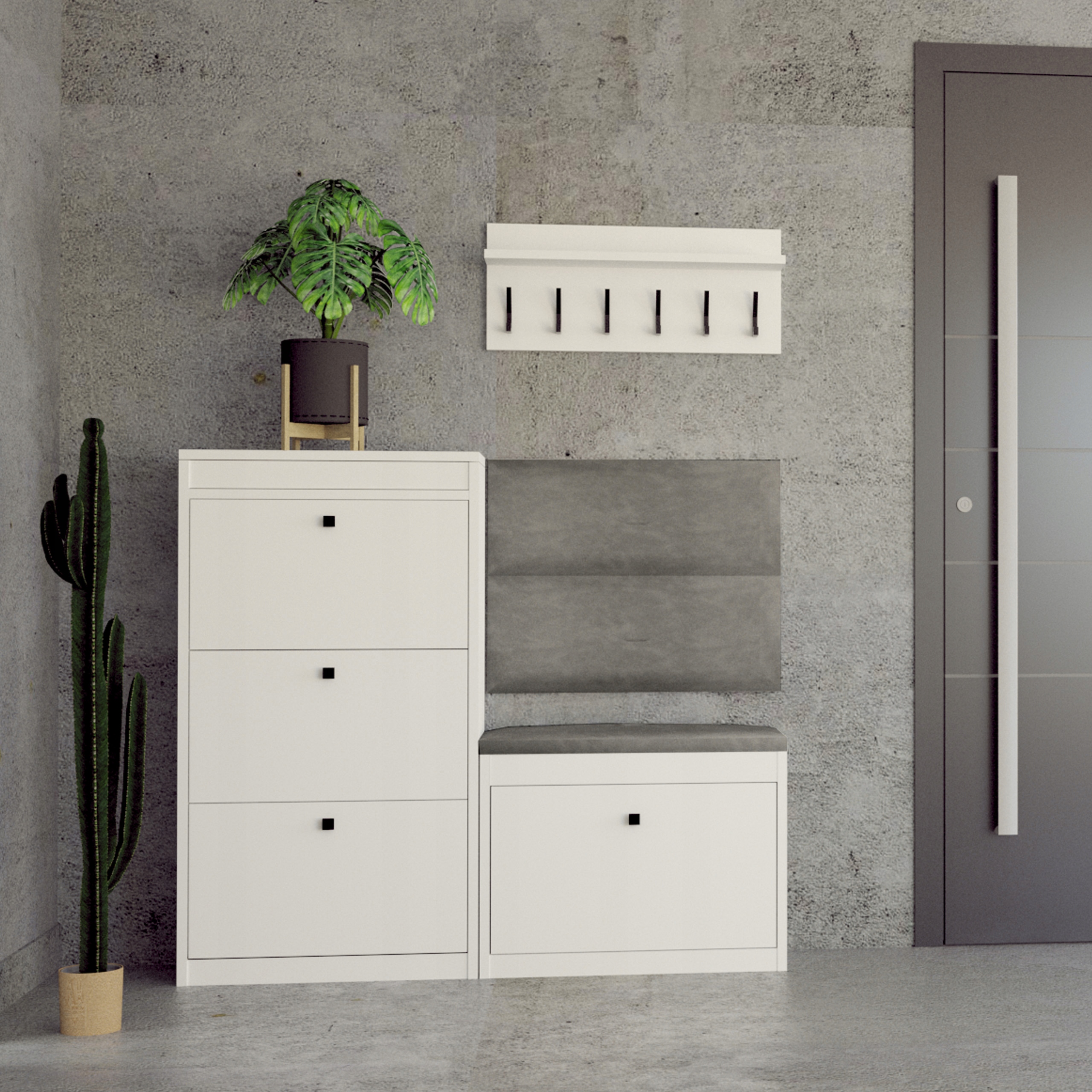 Відкидні відділення в шафах вміщають багато пар взуття, під зручним сидінням є приховане відділення для тапочок і аксесуарів, таких як крем для взуття. Шафи та вішалка чудово заповнять передпокій та допоможуть зберегти порядок. Дві стінові панелі зроблять ваш дім затишнимі ви зможете зручно спертися на них під час взування.