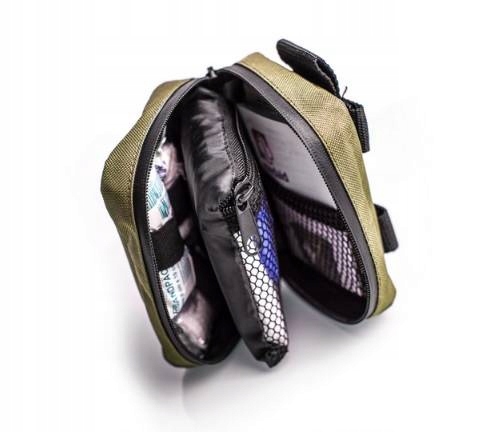 Аптечка виготовлена з міцного матеріалу, що робить її високостійкою до стирання. Завдяки використанню закритих кишень аптечка залишається на місці після її відкриття та розкладання. Вона має спеціальну систему кріплення для велосипеда. Оснащений аж 22 елементами, завдяки чому дозволяє надати першу допомогу при: порізах, вивихах, розтягненнях, переломах, переохолодженні, обмороженні ока,раптовій зупинка серця, травми. Аптечка: