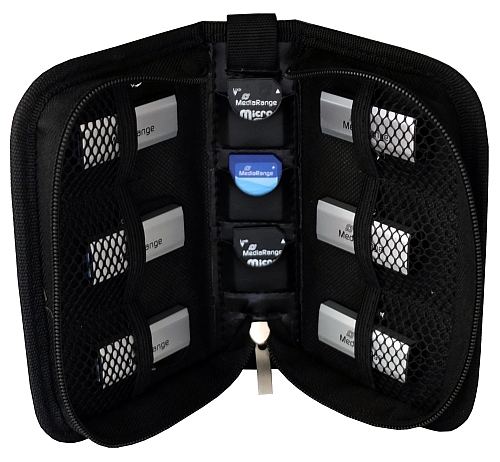 MediaRange BOX98 — це унікальний чорний, нейлоновий і посилений футляр/органайзер для карток пам’яті та флешок.