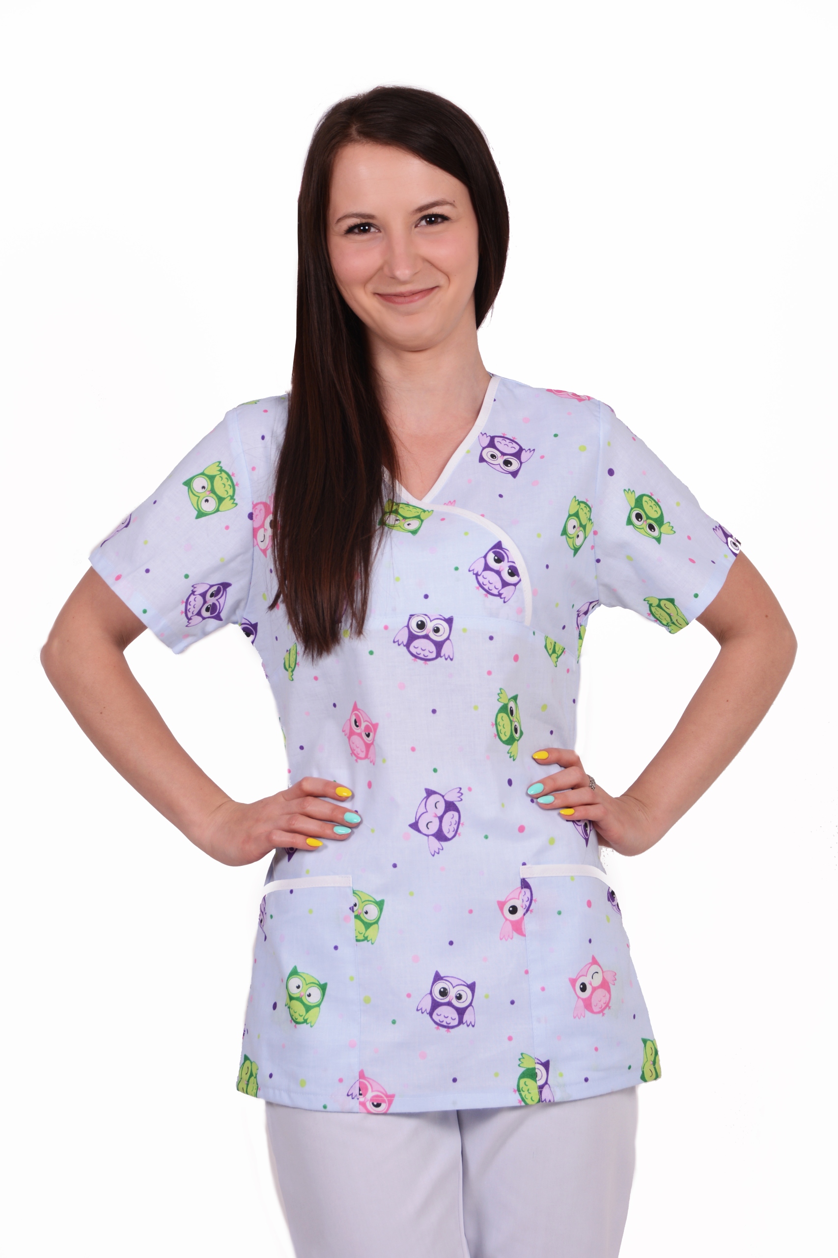 Толстовка закінчена під шиєю, пришитим один на одного V-подібного вирізу, коротким рукавом. Два нижні, місткі кишені. Класичні штани, на барі з кнопкою дрімоти.