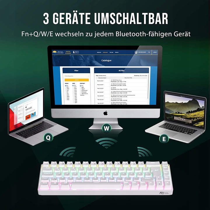 Надійна продуктивність: клавіатуру оснащено оновленим чіпом, кожна дія клавіші записується миттєво, а стабільне бездротове з’єднання забезпечує справжній досвід друку. Легко перемикайте 3 різні пристрої за допомогою клавіш FN + Q/W/E. У бездротовому режимі це забезпечує максимальну продуктивність.