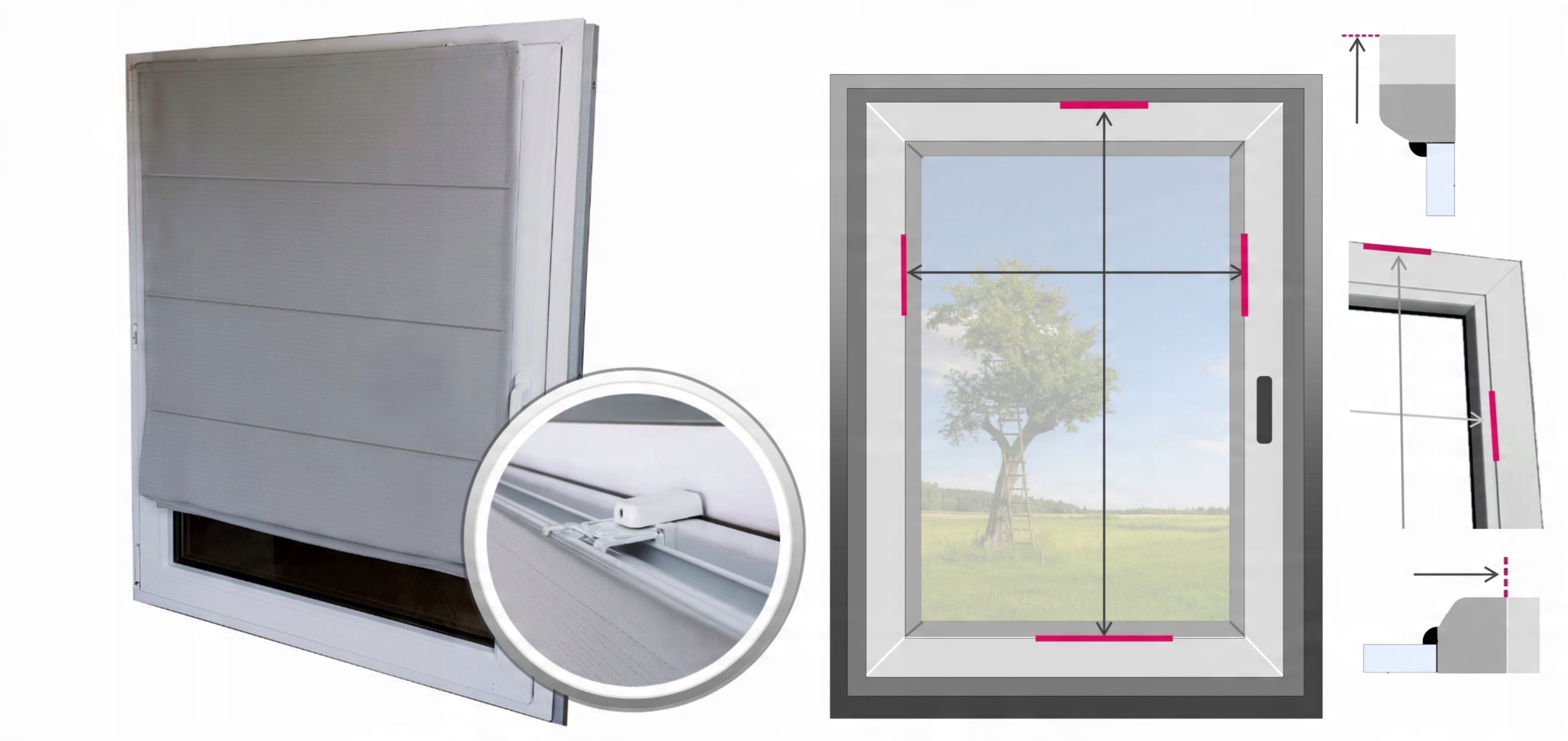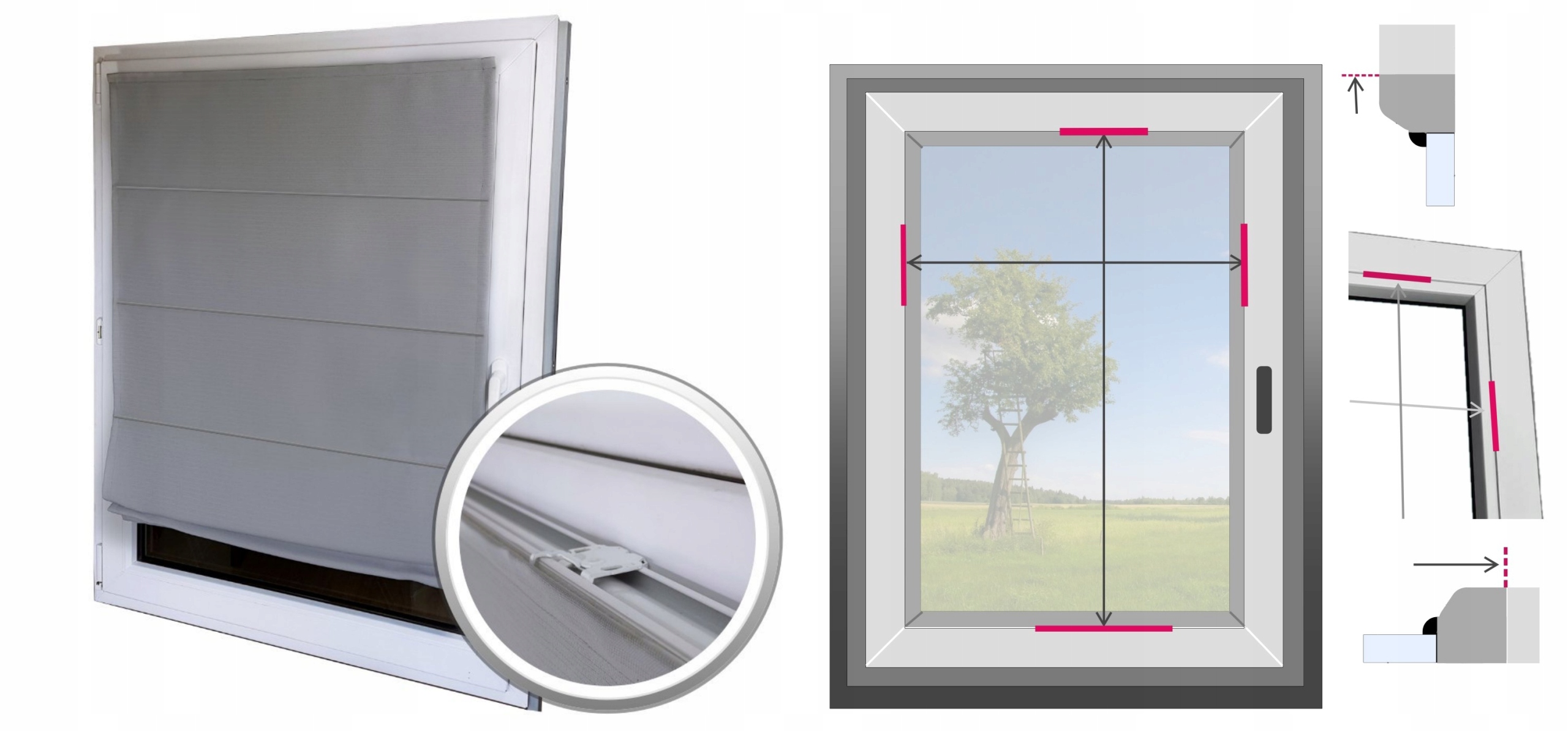- Для версії встановлення (3) на гліфі: Виміряйте ширину віконної виїмки (гліф) і відніміть, наприклад, 2 см, щоб рулонна штора могла вільно працювати