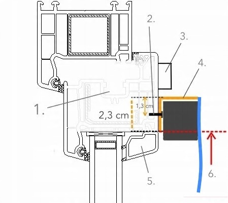 - У цьому типі монтажу ручка рулонної штори прикручується над стиком рами та штапика. Ми завжди автоматично додаємо висоту ручки 2,3 см до розміру висоти, зазначеного в інструкціях нижче, щоб її можна було встановити на плоскій і стійкій поверхні рами.