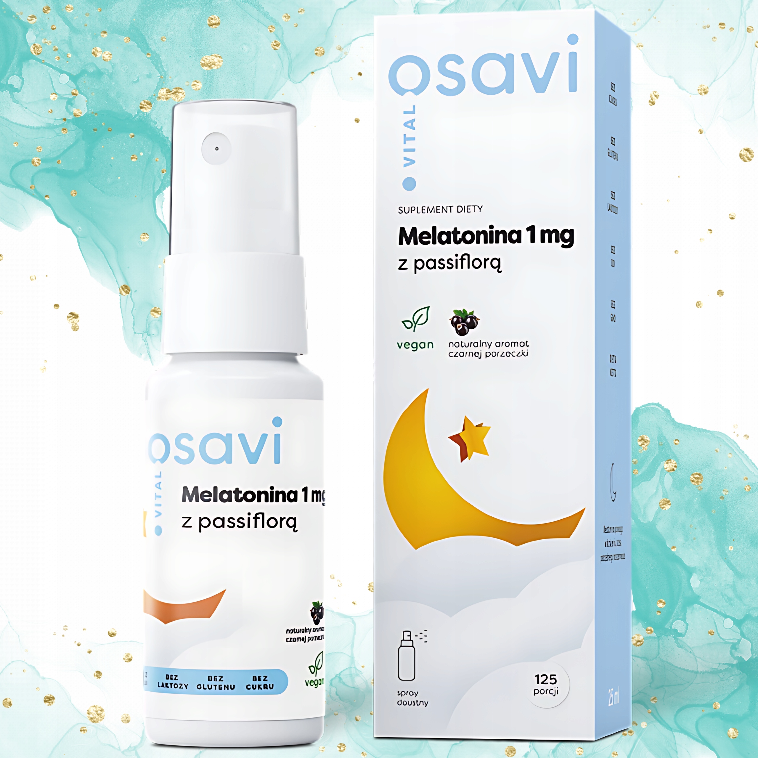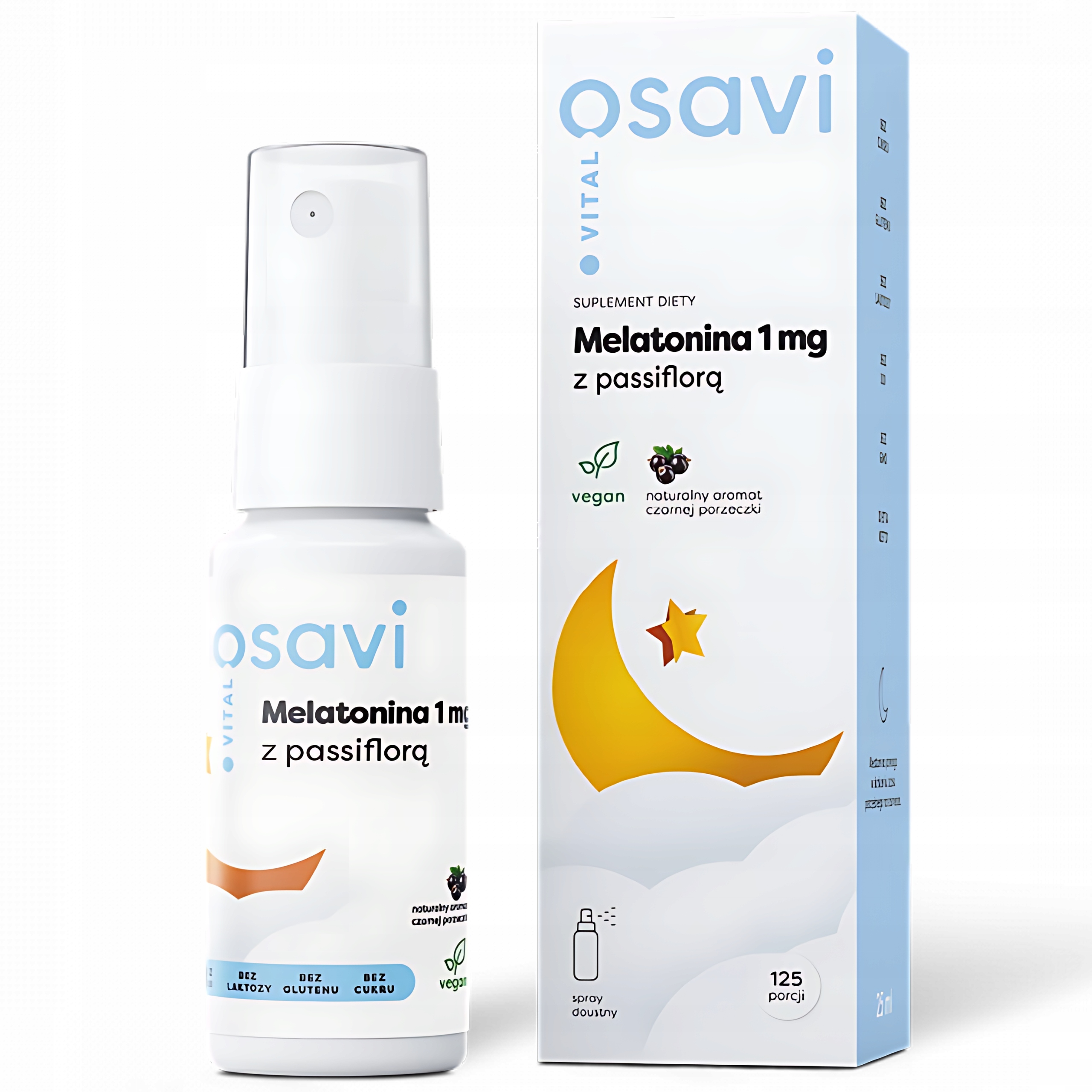 OSAVI Мелатонін 1 мг з пасифлорою — це дієтична добавка, доступна у формі спрею для ротової порожнини. Він містить мелатонін, який допомагає скоротити час, необхідний для засинання, і полегшити суб’єктивне відчуття часових поясів. Продукт збагачений екстрактами листя пасифлори (Passiflora incarnata) і меліси (Melissa officinalis), які сприяють розслабленню і спокійному сну. Спрей має аромат чорної смородини, підсолоджений ксилітом і не містить цукру.