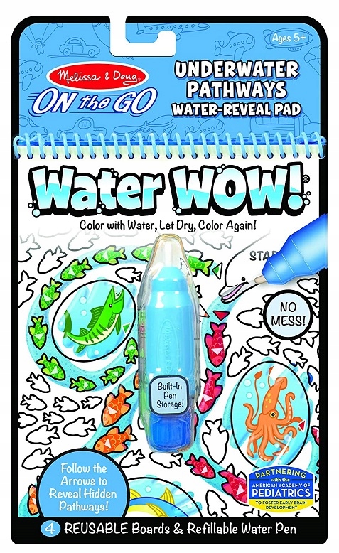 Вода WOW! - це фантастичний продукт від Melissa & Doug, який дозволить дітям кольорові шаблони без використання олівців! Весь процес відбувається завдяки спеціальній ручці, яка повинна бути наповнена водою - після нанесення наконечника на вказане місце ми побачимо, як білі елементи починають брати кольори, і наші очі починають демонструвати різні, барвисті картини.