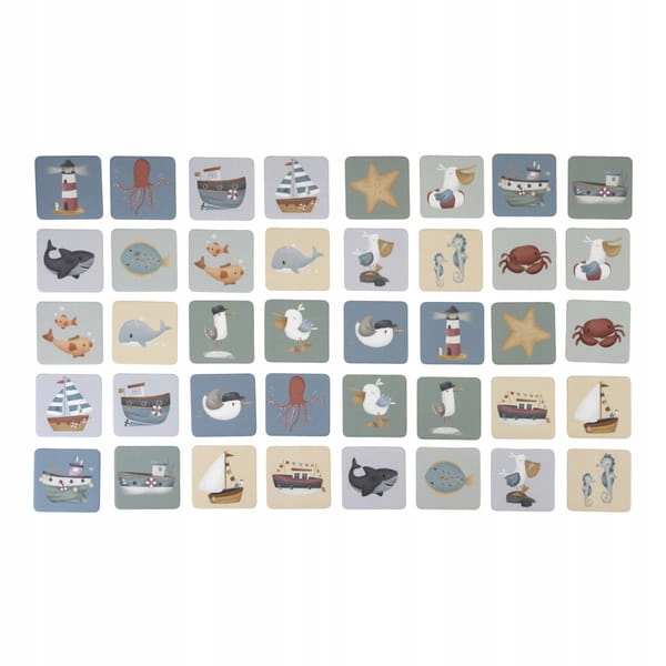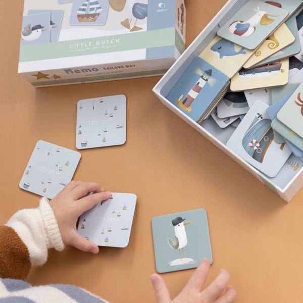 Гра на пам’ять від Little Dutch з колекція Sailors Bay. У грі 40 різних карток, які потрібно зіставити попарно. У гру можуть грати від 1 до 4 гравців. Пам'ять тренує концентрацію, терпіння і вчить запам'ятовувати. Кожна листівка виготовлена з щільного міцного картону. Упаковано в зручну коробку для зберігання. Приємна вітрильна тема зробить кожну гру приємнішою. Він доповнює інші продукти з колекції Sailors Bay. Ідеальна ідея для подарунка.