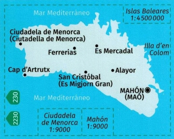 Складена, ламінована туристична карта Мінорки з іспанського балеарного архіпелагу за шкалою 1: 50 000, збагачених планами міста: Ciudadela de Menorca (Ciutadella de Menorca) та Махон (Мао) за шкалою 1: 9000.